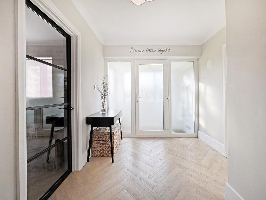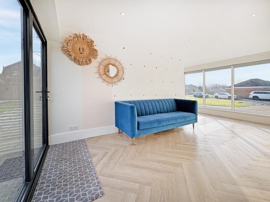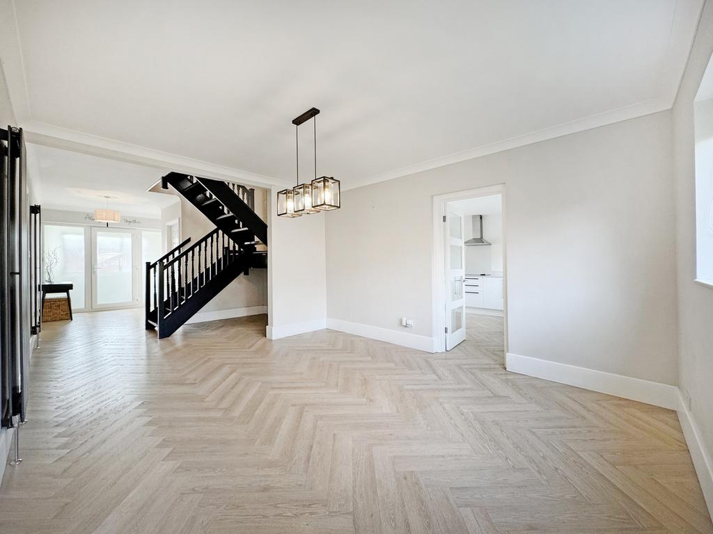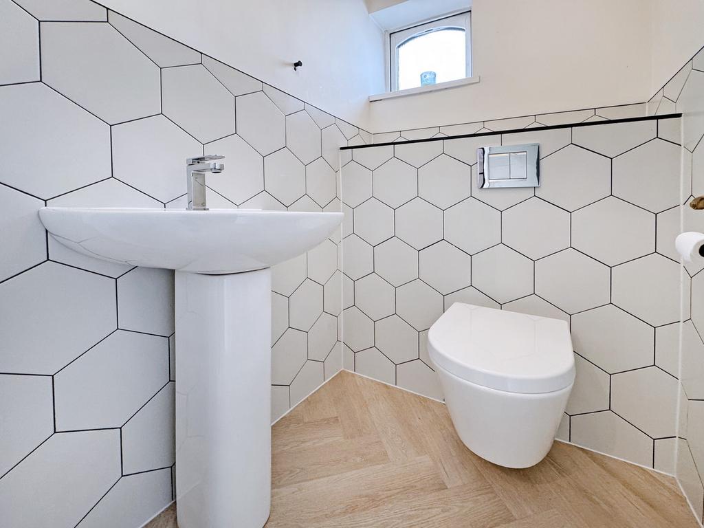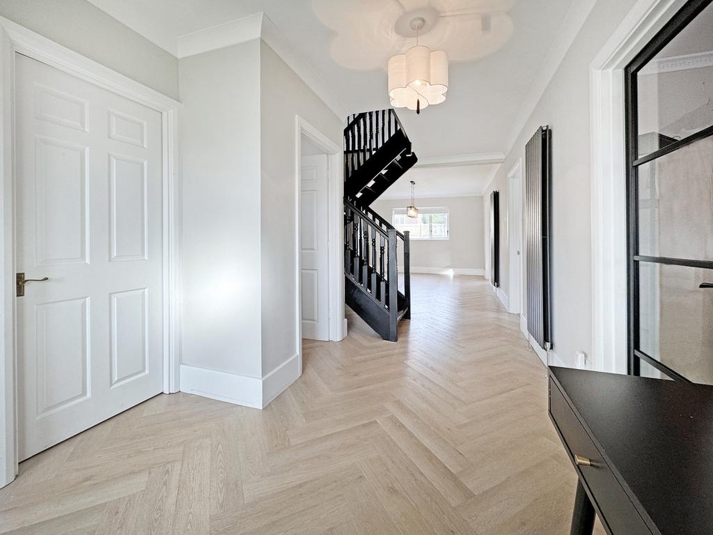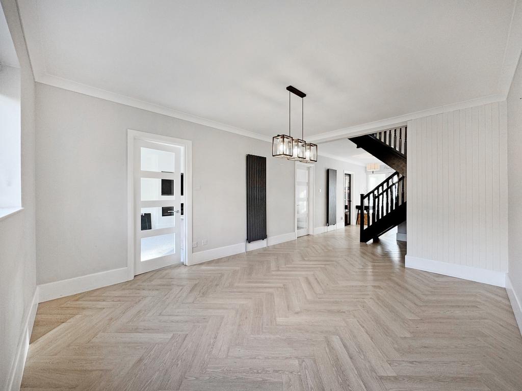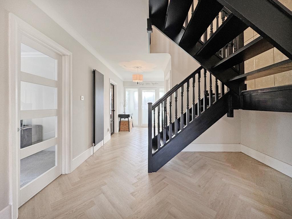 The main porchway is flooded with natural light, with luxury wooden flooring flowing underfoot laid in a herringbone style, which runs seamlessly throughout the majority of the ground floor. A full width glazed doorway connects through to a spacious central hallway, which runs full aspect and benefits from a cloak room to the left, along with an adjacent guest washroom. The guest washroom is fitted with pale grey hexagonal wall tiles, white sink and wall mounted toilet, with chrome recessed push button flush. A pair of modern grey wall mounted radiators run almost full height, providing warmth into the hallway. The rear of the hallway opens up and was previously used as a central dining room.