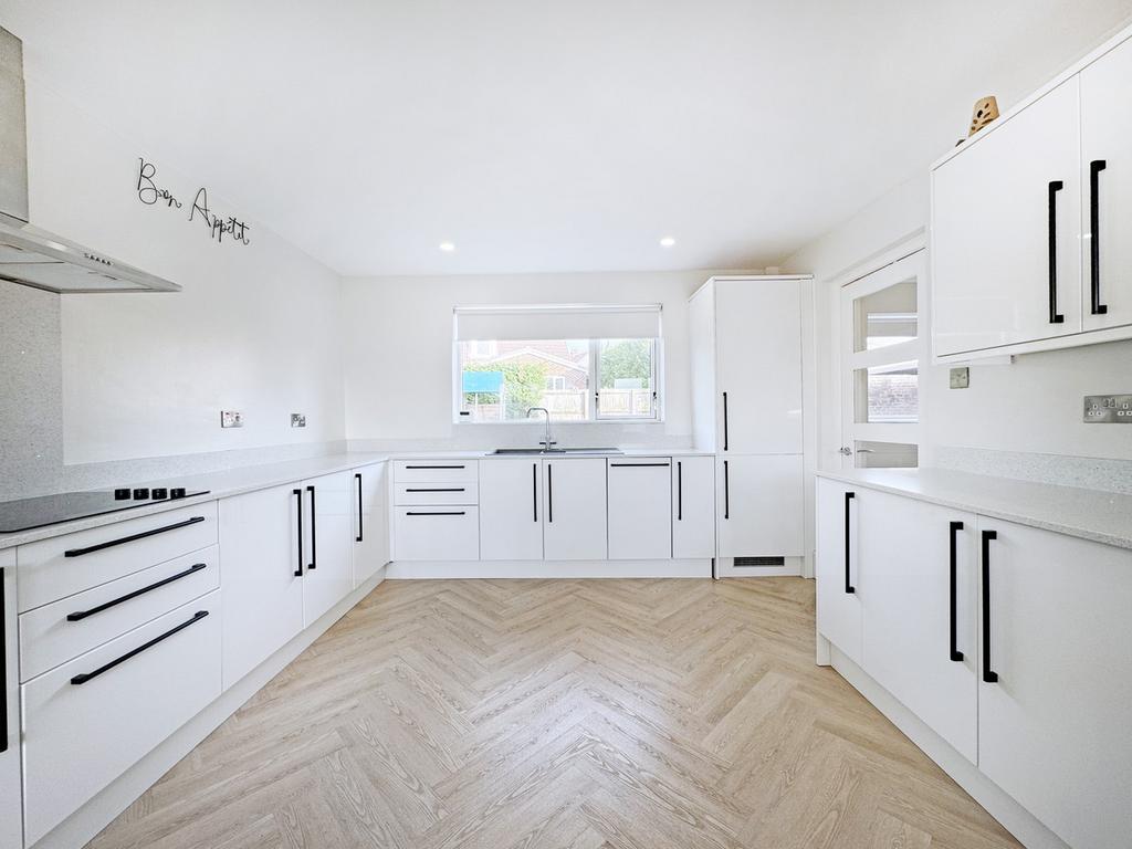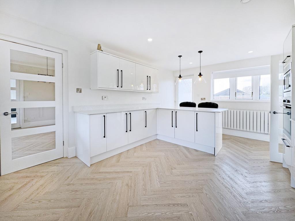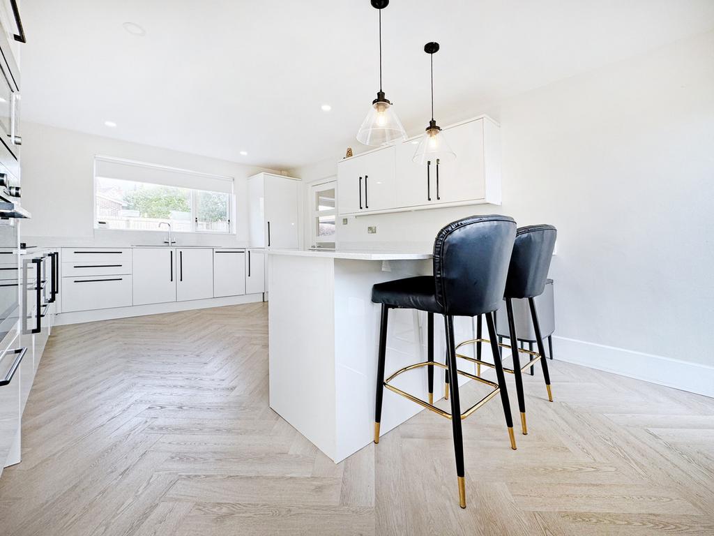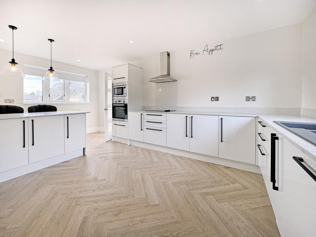 Opposite the living room, across the dining room, you’ll discover a large family kitchen which runs full aspect. The kitchen is fitted with a wealth of fitted units, finished in a minimalistic sleek white with elongated matt black door handles. Low level units span out to form a breakfast bar, which works well as a social hub. Ceiling recessed spotlights illuminate the kitchen with a pair of pendant lights hanging over the breakfast bar.
