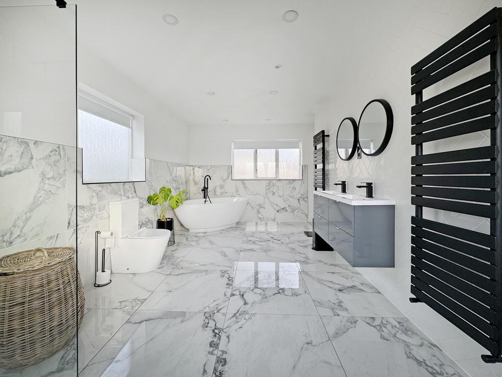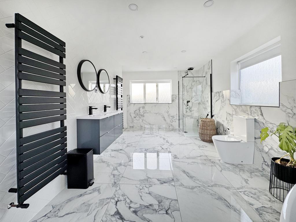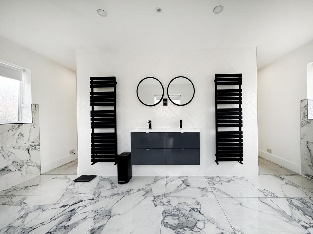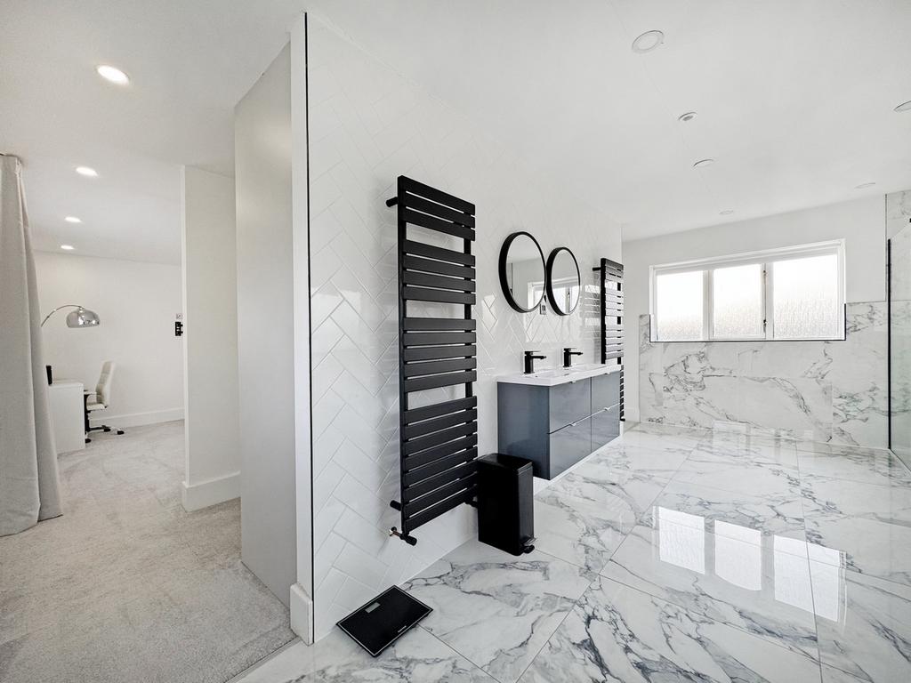 The master bedroom suite is a truly indulgent space finished throughout in a monochrome palate of pale greys, white and black. As you enter the suite, you’re welcomed into a large main bedroom with a central zonal wall with grey panel detailing, providing open access to either side. A walk in wardrobe runs parallel behind the zonal wall with recessed ceiling spotlights and mirrored sliding wardrobes. The rear of the master suite opens up to a jaw dropping ensuite bathroom. Oversized white tiles with grey marbling spans across the floors and walls throughout. The ensuite is fitted with a minimalist full height glazed shower with ceiling mounted black rainfall head, along with a stunning elliptical freestanding feature bath with matt black floor mounted taps. Completing the ensuite you’ll find a modern white toilet, a pair of wall mounted landscape sinks with gloss grey vanity units and a matt black full height towel radiator to either side. Gloss white brick tiles laid in a herringbone style cover the entire central walls flowing behind the sinks.
