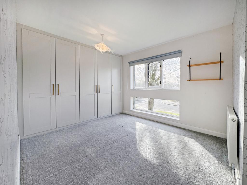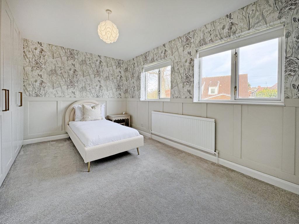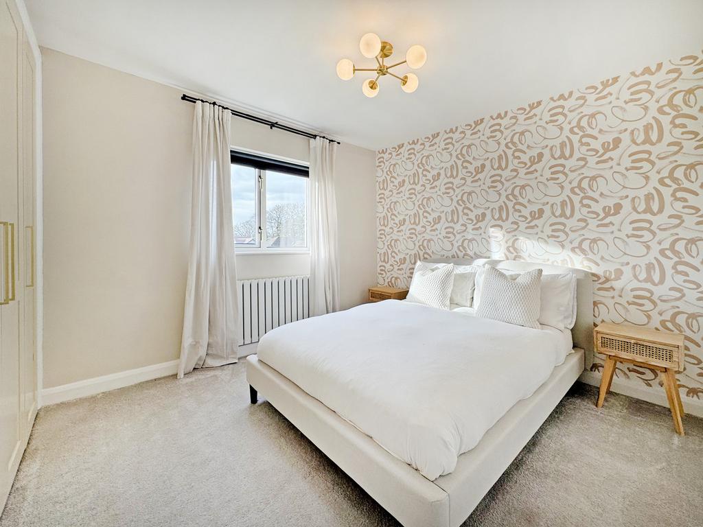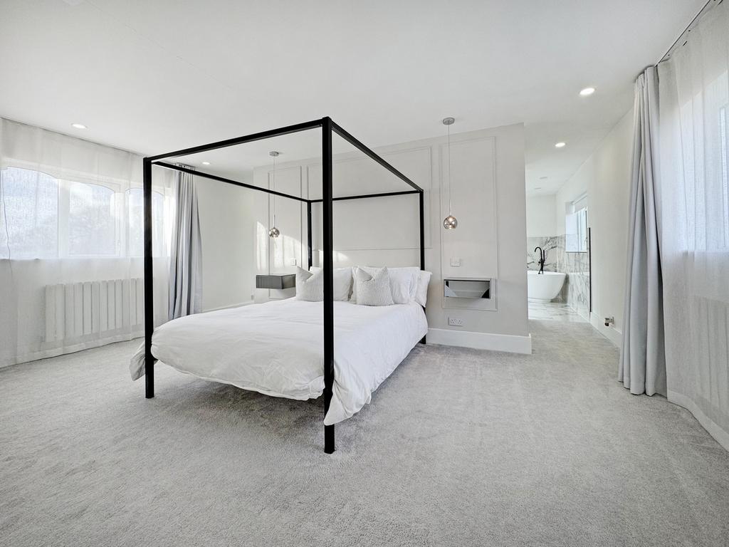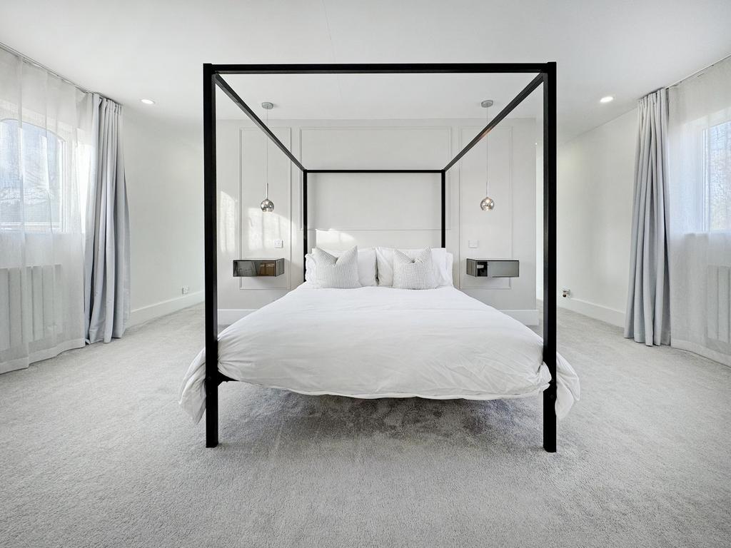 The master bedroom suite is a truly indulgent space finished throughout in a monochrome palate of pale greys, white and black. As you enter the suite, you’re welcomed into a large main bedroom with a central zonal wall with grey panel detailing, providing open access to either side. A walk in wardrobe runs parallel behind the zonal wall with recessed ceiling spotlights and mirrored sliding wardrobes. The rear of the master suite opens up to a jaw dropping ensuite bathroom. Oversized white tiles with grey marbling spans across the floors and walls throughout. The ensuite is fitted with a minimalist full height glazed shower with ceiling mounted black rainfall head, along with a stunning elliptical freestanding feature bath with matt black floor mounted taps. Completing the ensuite you’ll find a modern white toilet, a pair of wall mounted landscape sinks with gloss grey vanity units and a matt black full height towel radiator to either side. Gloss white brick tiles laid in a herringbone style cover the entire central walls flowing behind the sinks.