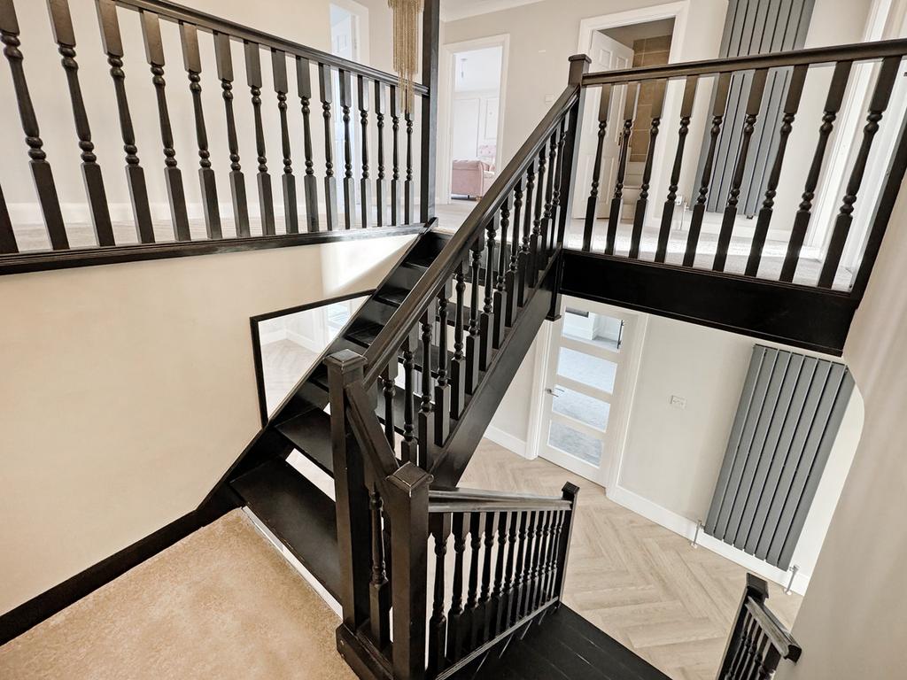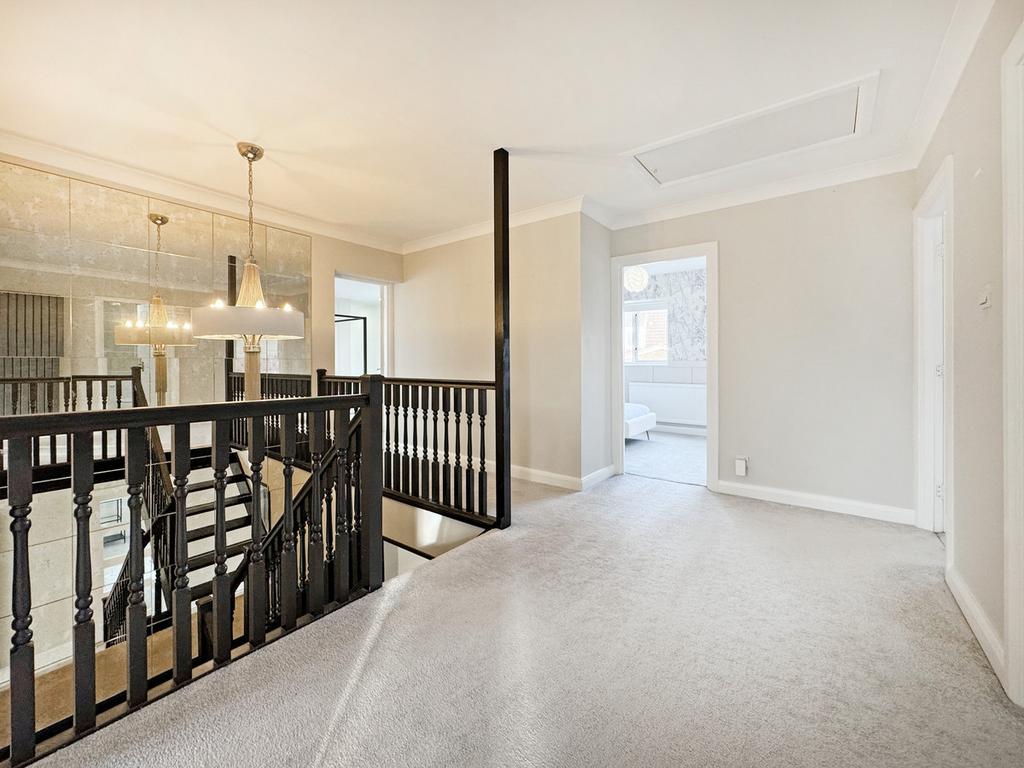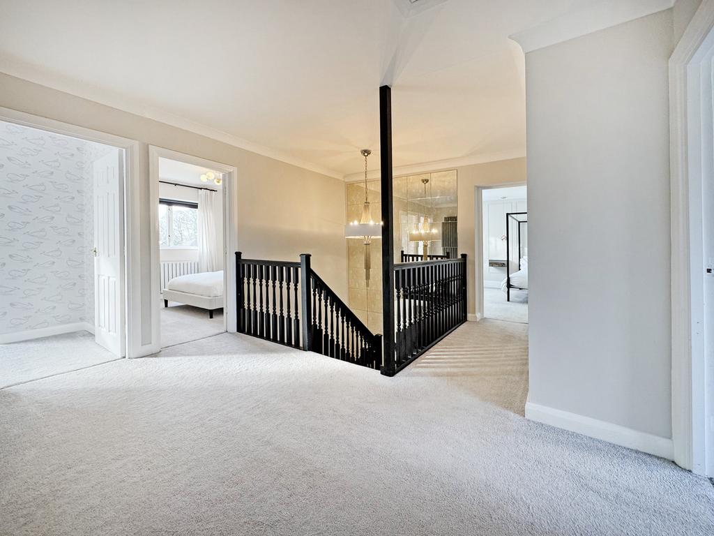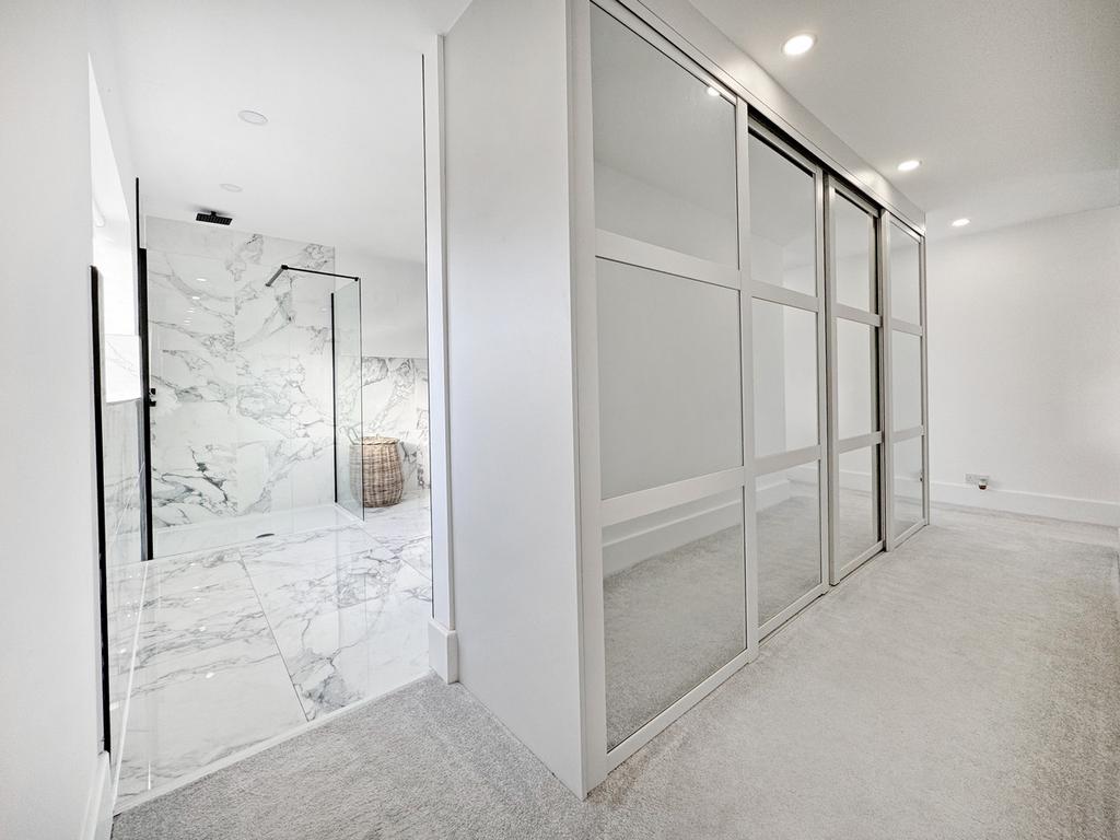 As you ascend the open tread, black spindle return staircase, you’re welcomed onto a vast first floor landing, which plays host to a family bathroom, 4 double bedrooms and a master suite. The flooring on the first floor switches to soft pale carpet, with the exception of the bathroom spaces. The vaulted staircase enjoys a distressed mirrored feature wall and a dramatic hanging pendant light. All of the bedrooms enjoy bespoke built in wardrobes. The family bathroom is fitted with a white suite, with the sink and toilet housed in a white gloss vanity unit, accompanied by a fitted bath and natural toned wall tiles.