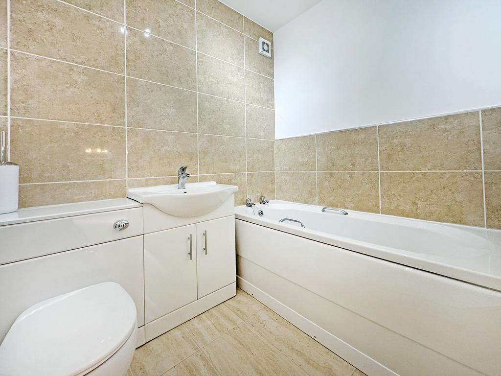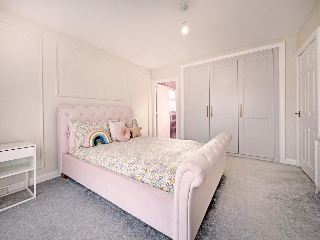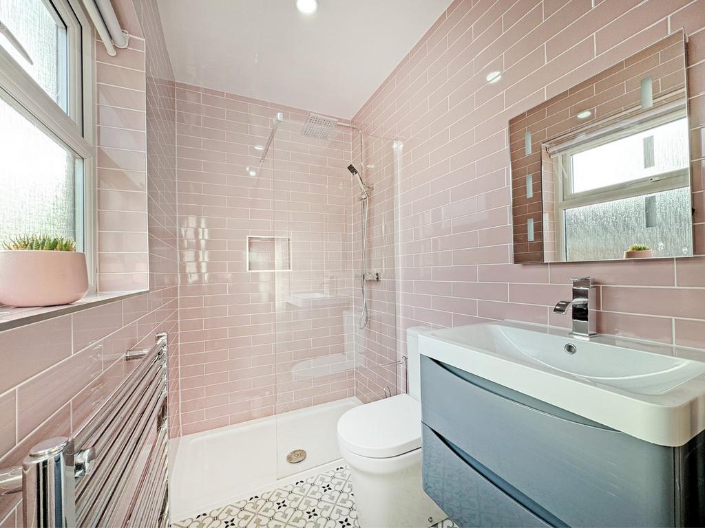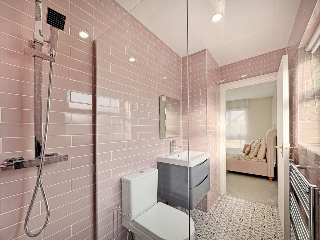 One of the double bedrooms is complimented by a spacious ensuite bathroom, beautifully finished with Victorian inspired floor tiles, gloss pastel pink brick wall tiles, modern white toilet, wall mounted landscape sink with gloss grey vanity unit, chrome toilet radiator and an oversized full height walk in shower.
