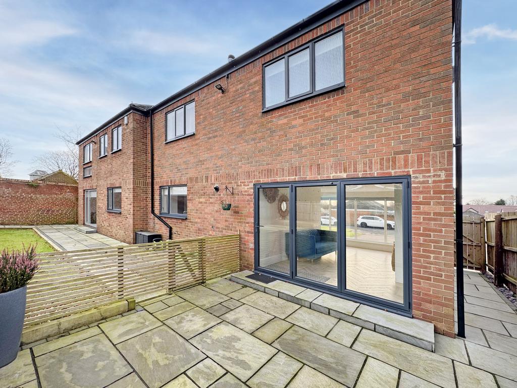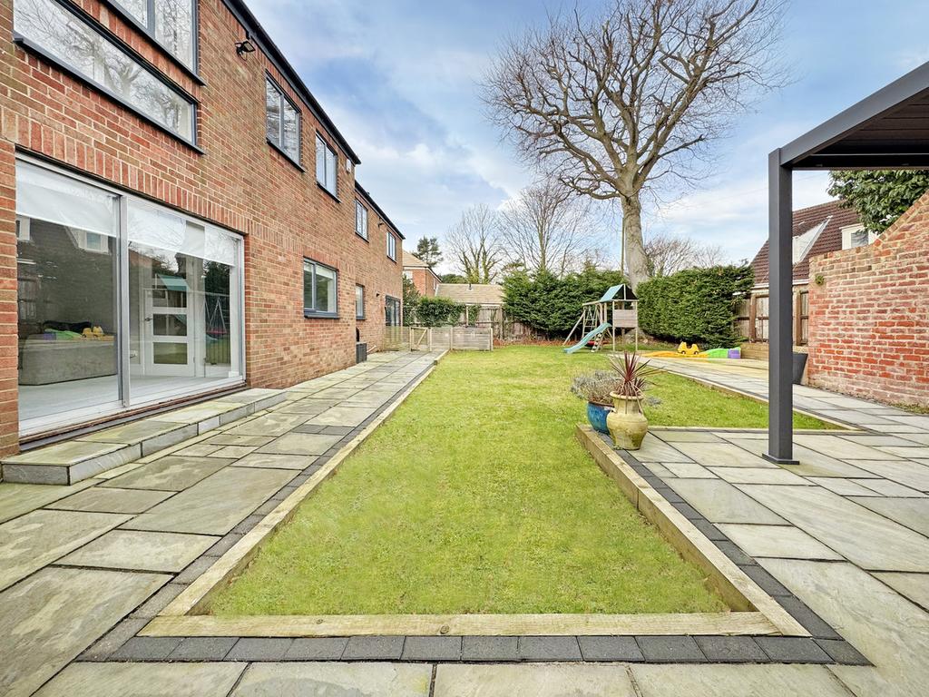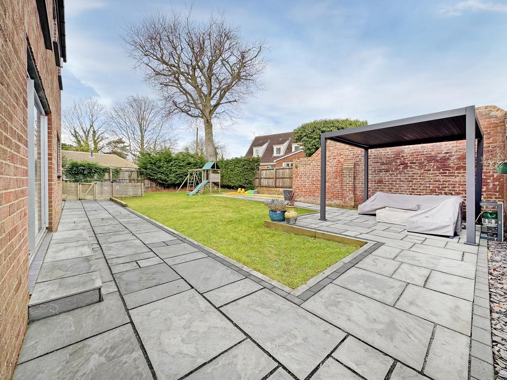 The private rear garden has been landscaped, presenting a blend of pale grey stone tiled patios and pathways with edge detailing, along with a central lawn.