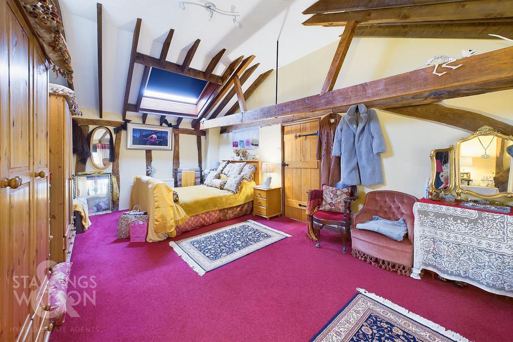 Heading up to the first floor galleried landing you will find a full height ceiling with exposed timbers. To the right of the landing is a dual aspect double bedroom with a plethora of character. In the other direction you will find another bedroom used as a dressing room currently and the family bathroom with shower over the bath. A door from the landing leads through to the main bedroom and en-suite shower room. The bedroom again offers a dual aspect as well as full height ceiling with exposed timbers.