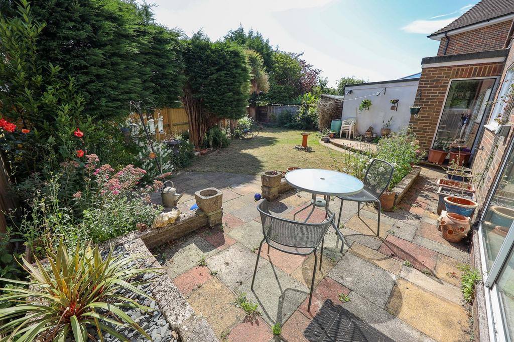 A private block paved driveway leads to the garage with a utility room behind. A side gate opens to the east facing 50’ wide x 30’ deep approximately rear garden. 2 areas of patio lead to an expanse of lawn bordered by conifers and a palm with a stream behind the fencing. Tap and power. Timber shed.