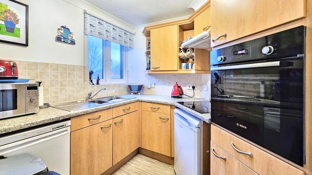 KITCHEN (2.4m x 2.3m approx)(7'8" x 7'5" approx) with vinyl floor, range of built-in units providing ample storage space, laminated worktops, tiled surrounds, stainless steel double sink unit, four ring ceramic induction hob with cooker hood over. High level 'Bosch' electric oven. Window, wall heater, pull alarm cord, five power points and spaces for fridge and freezer.
