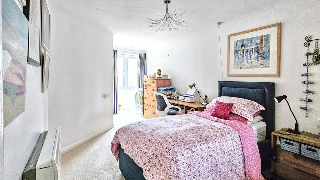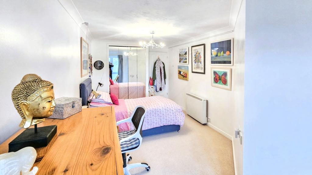 BEDROOM (5.2m x 2.8m approx)( 17' x 9'1" approx) with fitted carpet, coving, night-storage-heater pull alarm cord, four power points, floor to ceiling window, TV point, and four power points. Wardrobe with mirrored doors.