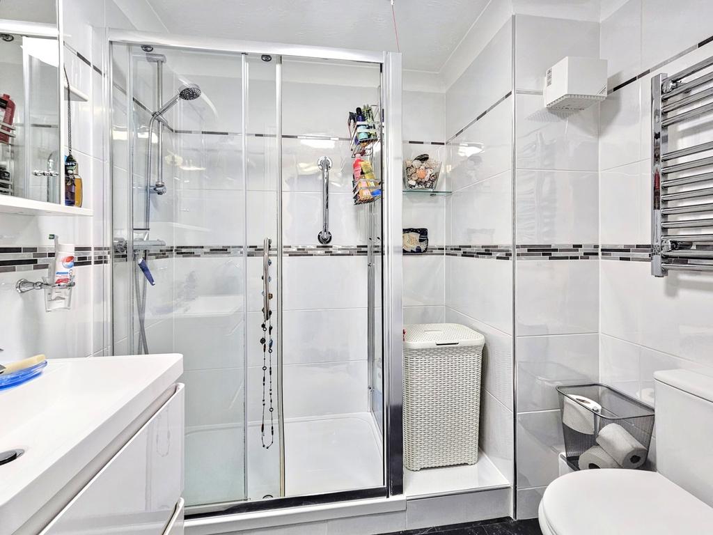SHOWER ROOM with vinyl floor, fully tiled walls, white suite with walk-in shower inc. grab handles, WC, and washbasin with drawers below and mirrored wall cabinet over with light. Heated towel rail and extractor fan.