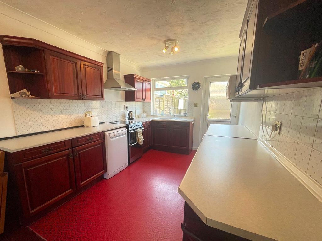 17’7” (5.39m) x 8’11” (2.47m). Dining space, telephone point, single drainer sink unit with mixer tap, and work surfaces with drawers, cupboards, space for washing machine under, space for fridge and freezer, shelved cupboards, wall cupboards, tiled splash backs, electric oven and gas hob, extractor hood over. UPVC double glazed door to rear garden