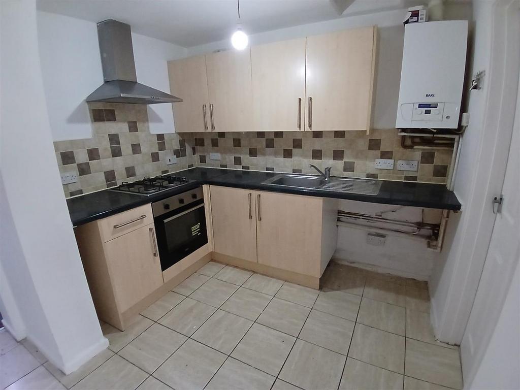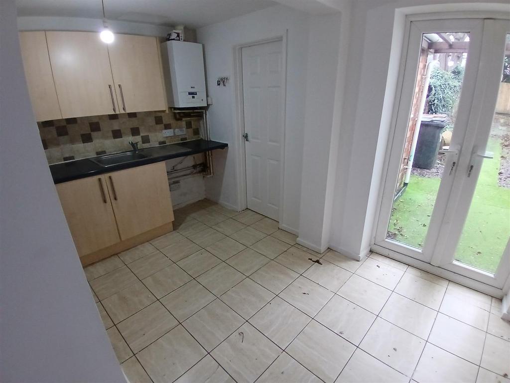 Kitchen - 3.00m x 2.84m (9'10" x 9'4") - Fitted with a matching range of base and eye level units with worktop space over, stainless steel sink unit with mixer tap with tiled splashbacks, plumbing for washing machine, electric oven, four ring gas with extractor hood over, radiator, ceramic tiled flooring, wall mounted combination serving heating system and domestic hot water, double glazed double door to garden, door to: