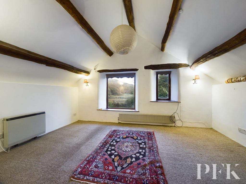 A spacious room with exposed ceiling timbers and apex beams, wall mounted lighting, radiator, night storage heater and access into a useful under eaves storage space.