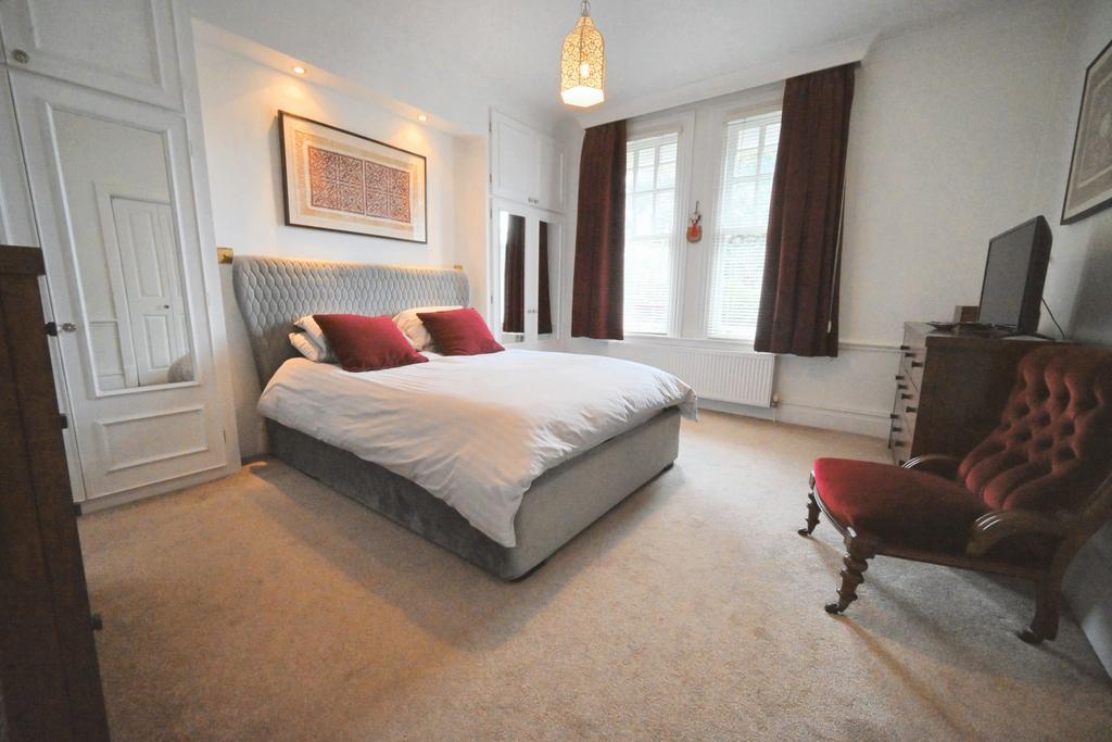 Twin floor to ceiling built in double wardrobes with overhead stores, radiator, coved ceiling, recessed ceiling spot lights, two hardwood double glazed sash windows to front and walk in wardrobe/ dressing room.