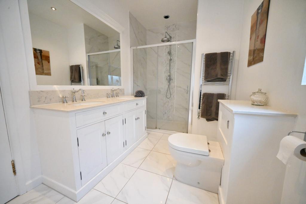 Refitted with a luxury bespoke white suite comprising walk in double shower with chrome Heritage style rainfall shower head with handheld spray, vanity unit with twin basins, granite worktops & wall mounted mirror over, recessed WC, period style white radiator with chrome heated towel rail over, further chrome heated towel rail, full width built in tall cupboards housing hot water system, recessed ceiling spot lights, marble effect ceramic tiled flooring and double glazed opaque window to side.