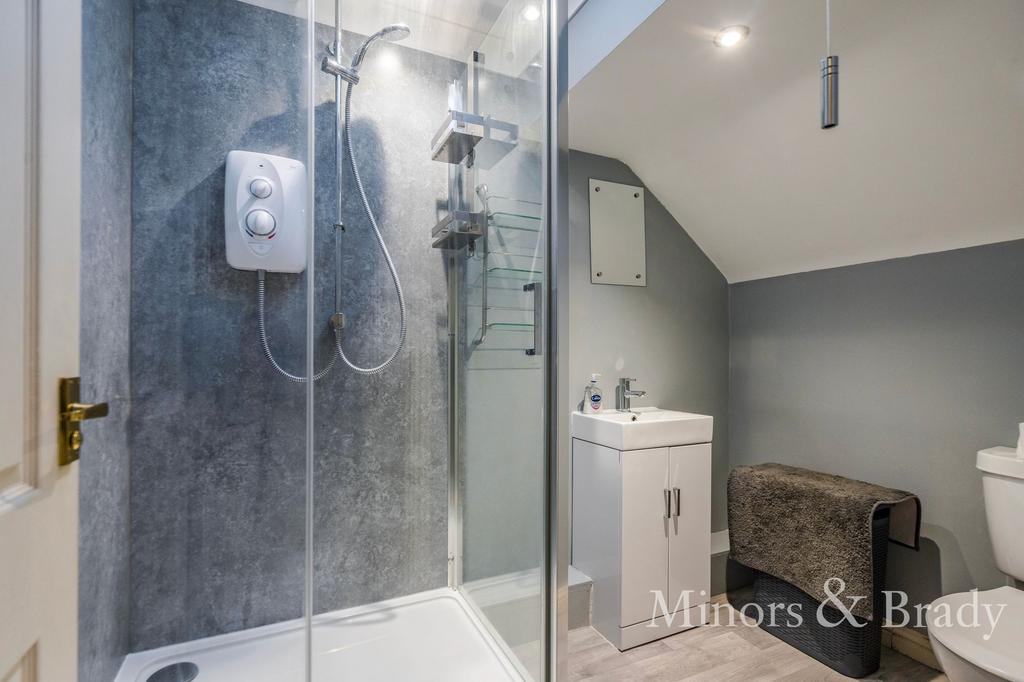 The shower room is modern and practical, complete with a skylight that enhances the space with natural brightness.
