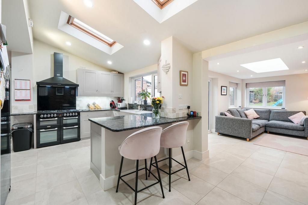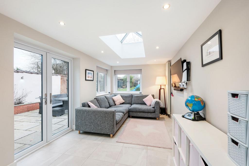 Upon entering, the welcoming entry hallway has a door that leads into the cosy sitting room, featuring a bay window and a log burner. Another door from the hallway leads into the modern open-plan kitchen/diner, complete with sleek granite countertops and integrated appliances. The generous space of the kitchen/diner easily accommodates a dining table, and is enhanced by a charming feature fireplace that adds both warmth and character. From here, the room flows into the lovely summer room, where double doors open out into the rear garden.
