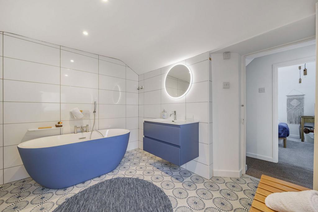 Obscure double glazed window to side. Freestanding bath with mixer tap shower. Close coupled WC. Vanity mounted wash hand basin. Wall mounted heated towel rail. Part tiled surrounds. Recessed spotlights.