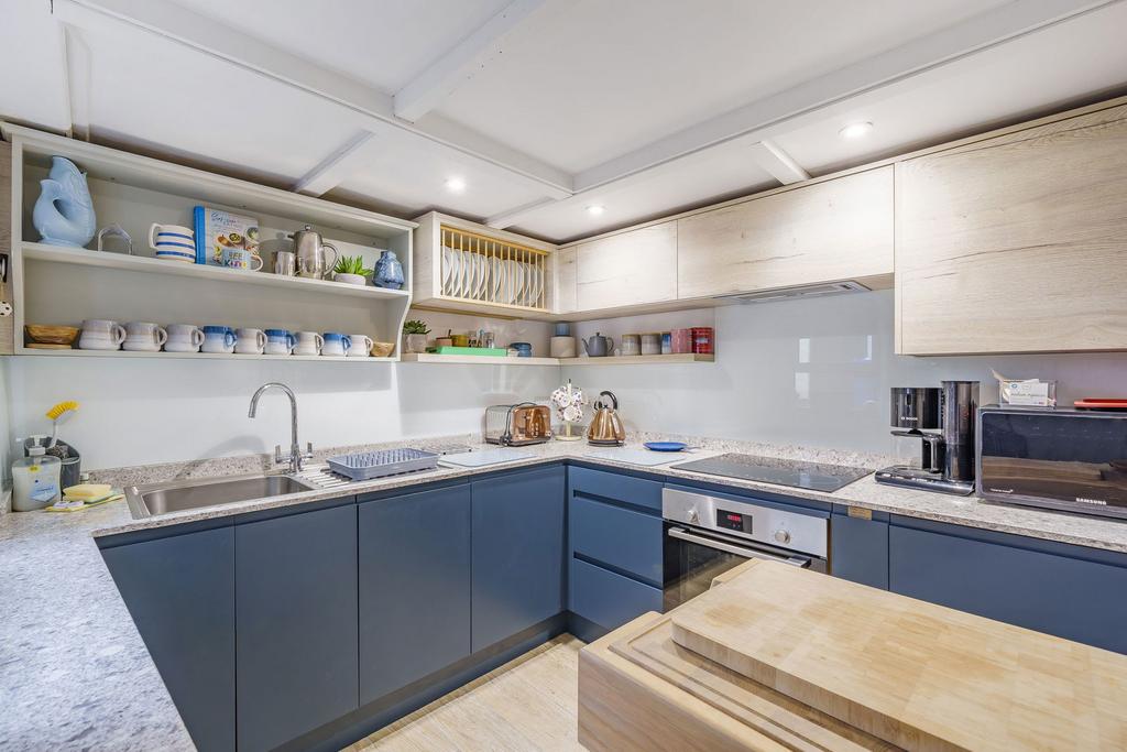 Double glazed window to side. Worksurface area with inset stainless steel sink and drainer along with an inset electric hob with extractor over and electric oven beneath. Cupboards and drawers below with an integral fridge and dishwasher. Cupboards, shelving and plate rack above. Recessed spotlights. Wood effect tiled flooring. Wall mounted electric heater.