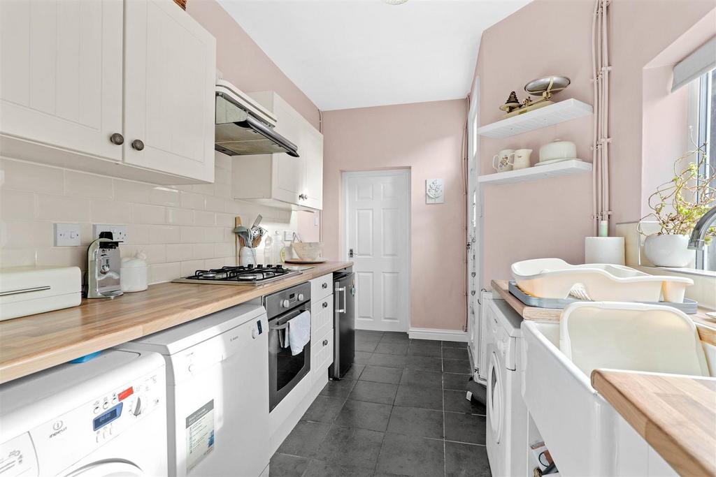 Kitchen - Variety of base units, Belfast sink with mixer tap, four ring gas hob with extractor above, electric oven, plumbing for washer and dishwasher, tiled flooring, double glazed window to side, central heated radiator, stable door allowing access to the garden.