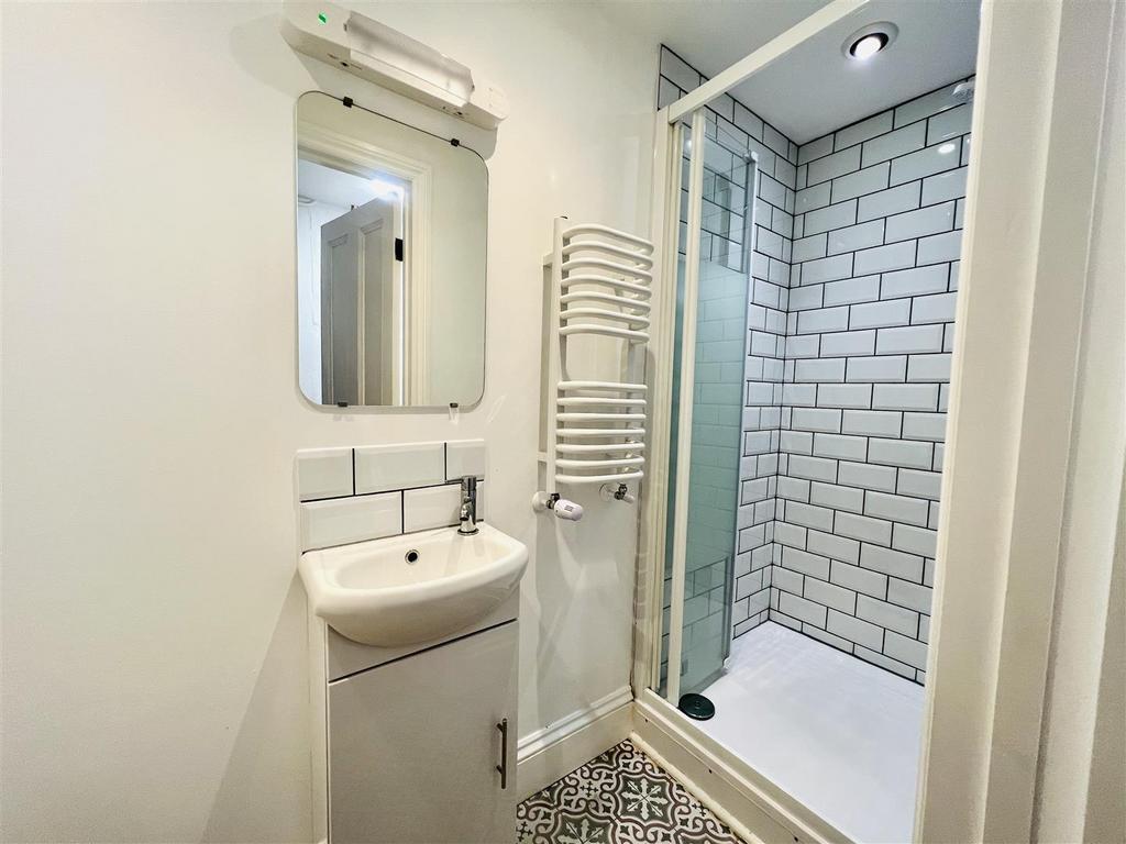 Shower Room - 2.87 x 0.89 - Mira shower in tiled and glazed cubicle. Hand basin with mixer tap on vanity. Low level w.c. Vanity light. White enamel towel heater.
