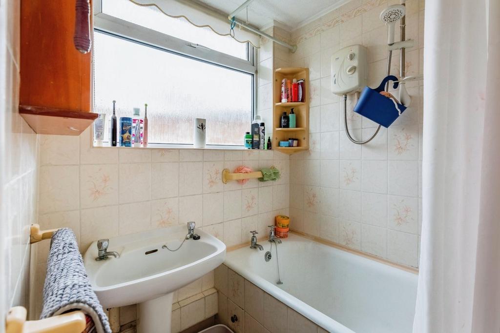 Bathroom - A two piece suite comprising of a wash hand basin, a panelled bath with an overhead shower, a mirrored cabinet, fully tiled walls and flooring, and an obscure rear aspect double glazed window.