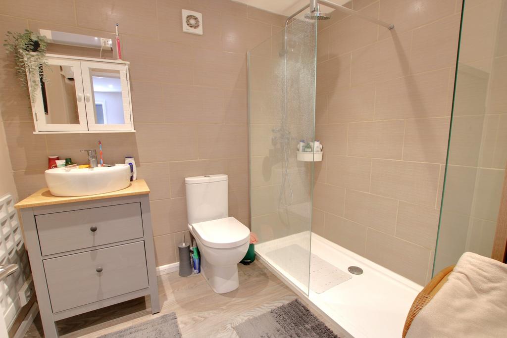 Double glazed obscure glass window to rear aspect. Coving to textured ceiling. Walk-in shower cubicle with rainfall shower head and separate shower attachment, pedestal wash hand basin with mixer tap and low level flush w.c. Heated towel rail. Cupboard housing wall mounted combination boiler.