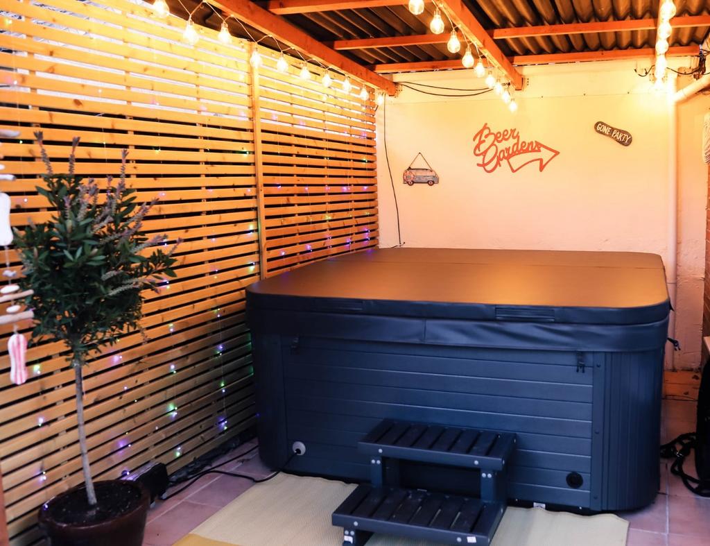 - Lawn, patio, decking, and hot tub space.