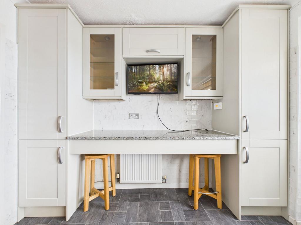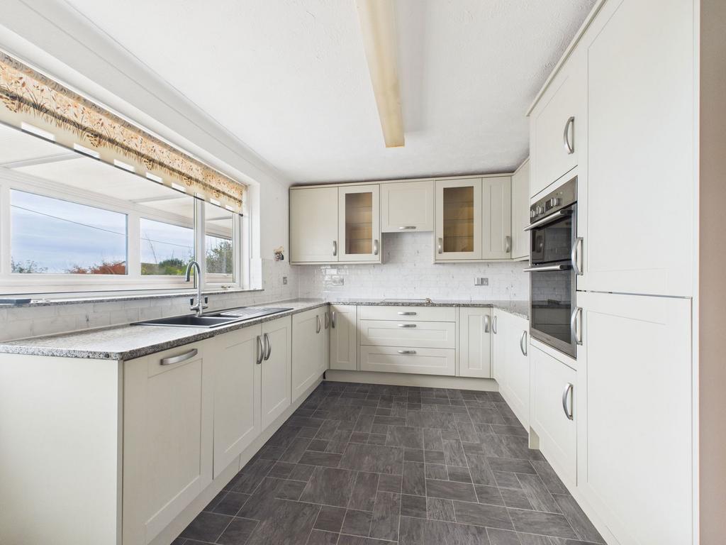 KITCHEN/BREAKFAST ROOM Range of modern quality units comprising 1.5 bowl sink, quartz work tops with extensive range of cupboards and drawers under. Matching wall units. Integrated electric hob and eye level double oven, washing machine, fridge and freezer and dishwasher. Further matching units with larder cupboard and breakfast bar. Central heating radiator. uPVC double glazing. Lovely sea views.
