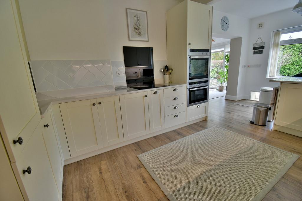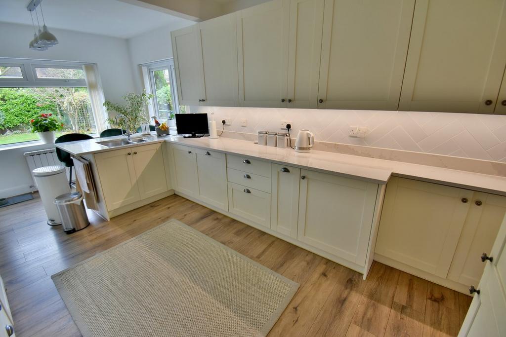 • Kitchen – bespoke traditional style kitchen comprising a range of base and wall mounted units with quartz worktops, Karndean style wood flooring, integrated Neff double oven and inset ceramic hob, 1½ bowl sink unit with mixer tap and further breakfast bar area, with windows to the side and rear. This area is open plan and flows seamlessly into the dining/family room