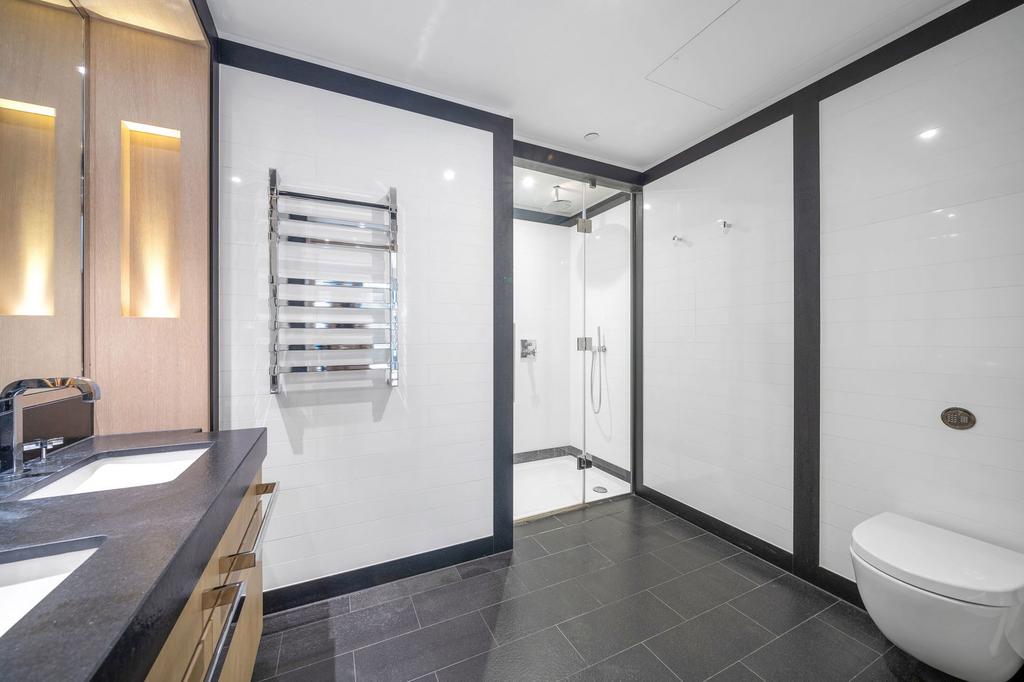 The apartment's well-appointed kitchen, cleverly designed on two sides, extends to a spacious, open plan reception room, with ample space for both dining and lounging. Large, full height glazed doors, spanning the room's breadth, lead out to a large balcony, deep enough for alfresco dining. The master bedroom also has glazed doors leading onto the balcony and a walk in wardrobe, providing entry way to an impressive ensuite shower room. The second bedroom has built in wardrobes and it's own designated shower room. The apartments at Embassy Gardens have been imaginatively designed, by World famous Luis Bustamante, their clean and contemporary style, incorporates many clever storage areas, to ensure uncluttered enjoyment of one's elegant home.