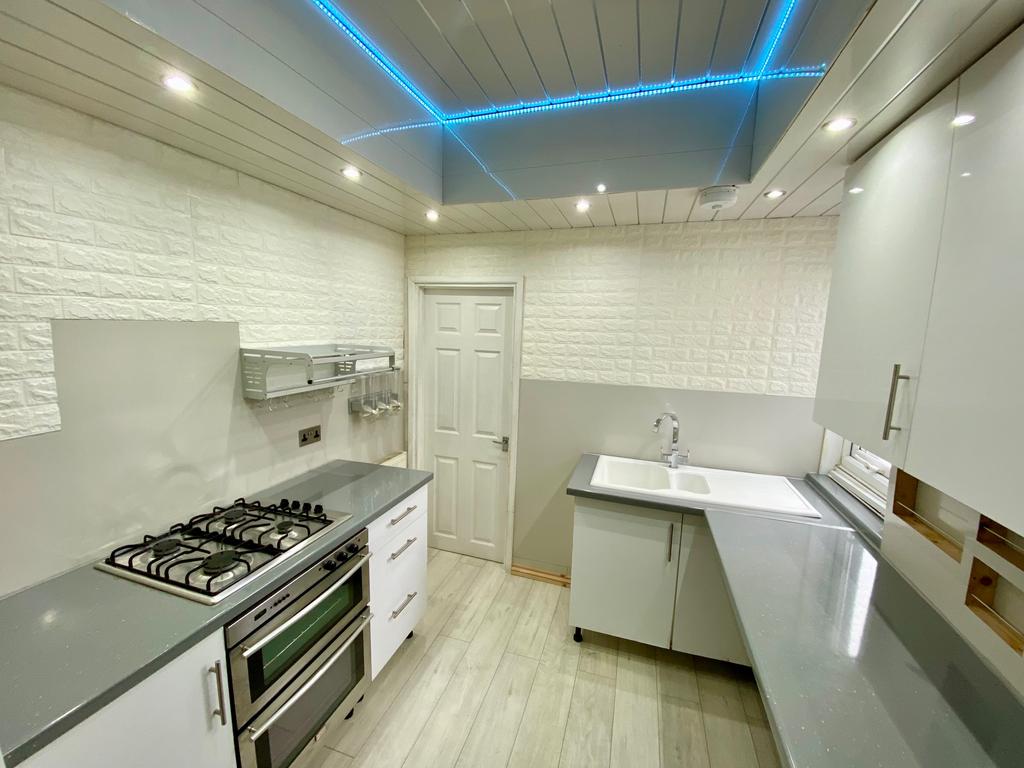 KITCHEN - Modern base and wall units in white with grey laminate worktops, built in oven, built in gas hob, brick effect wall, plastic clad ceiling, inset spotlights, light strip, white composite sink unit, laminate flooring, UPVC double glazed window.
