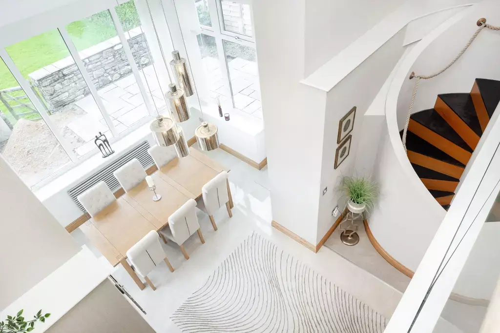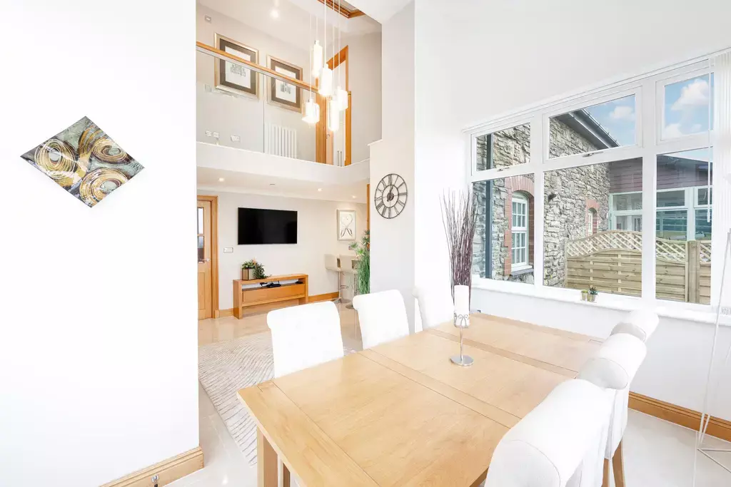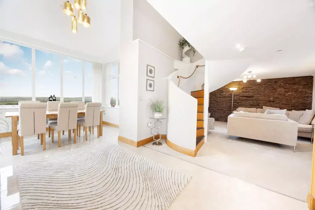 The beautifully presented accommodation features a welcoming grand entrance hall leading to an impressive open-plan sunroom/dining room with delightful rural views, a characterful living room with an exposed Manx stone wall and feature fireplace/media wall, and a stylish kitchen, separate utility room and a cloakroom (WC). A standout feature of the home is the curved contemporary staircase leading to a stunning glazed galleried landing.