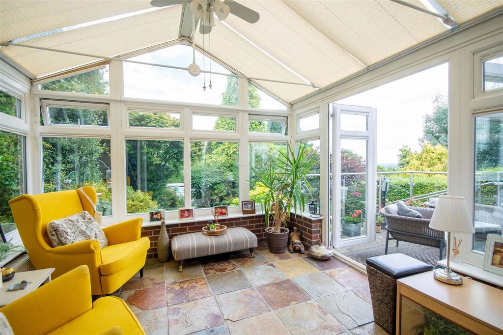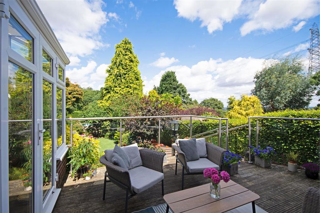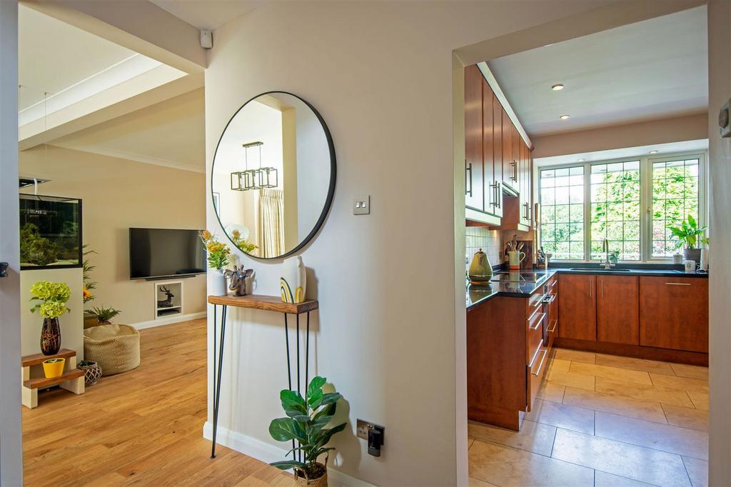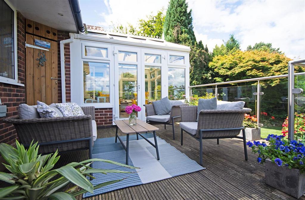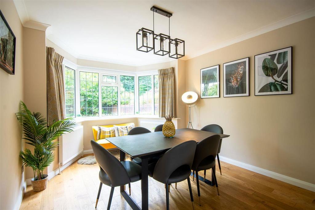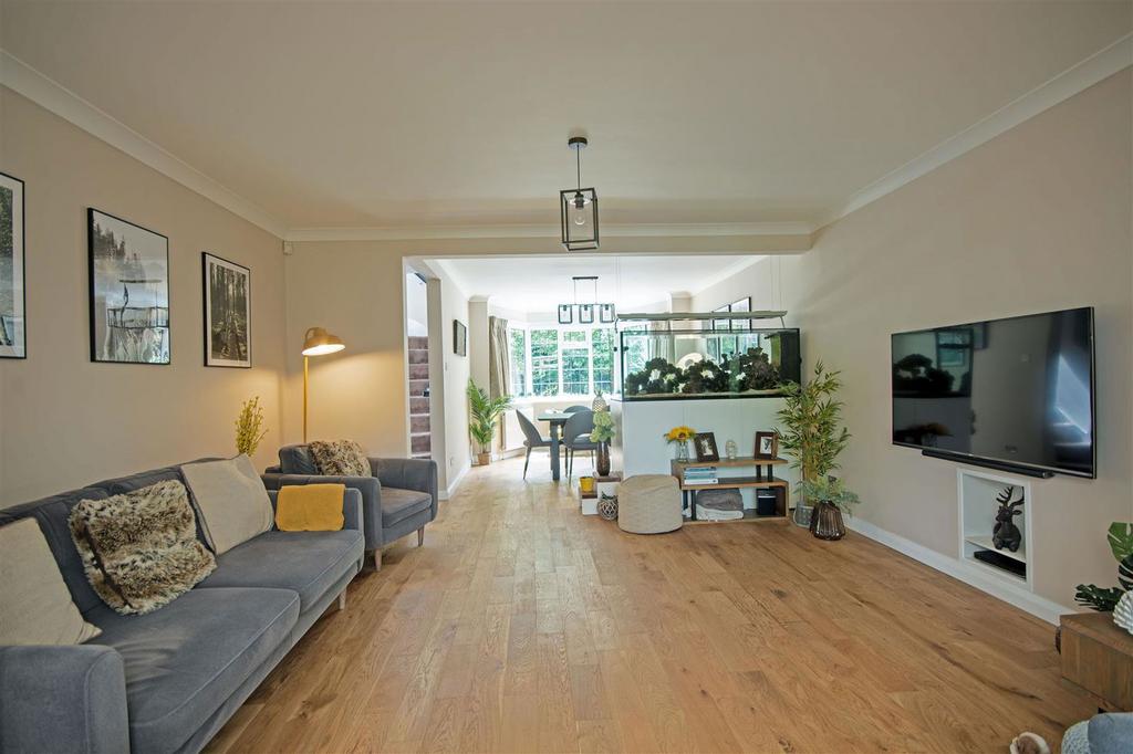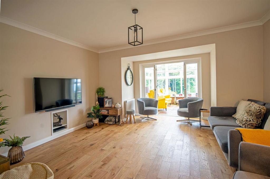 The spacious dining room to the front features a bay window and flows effortlessly into the open plan living room, an ample space for entertaining family and friends. To the rear of the living room, double doors lead to the delightful, bright, garden room, with access to the outside decking area, ideal for a quiet, relaxing morning coffee.