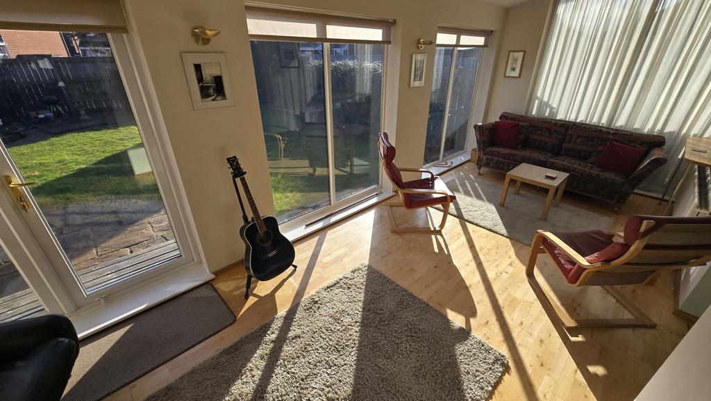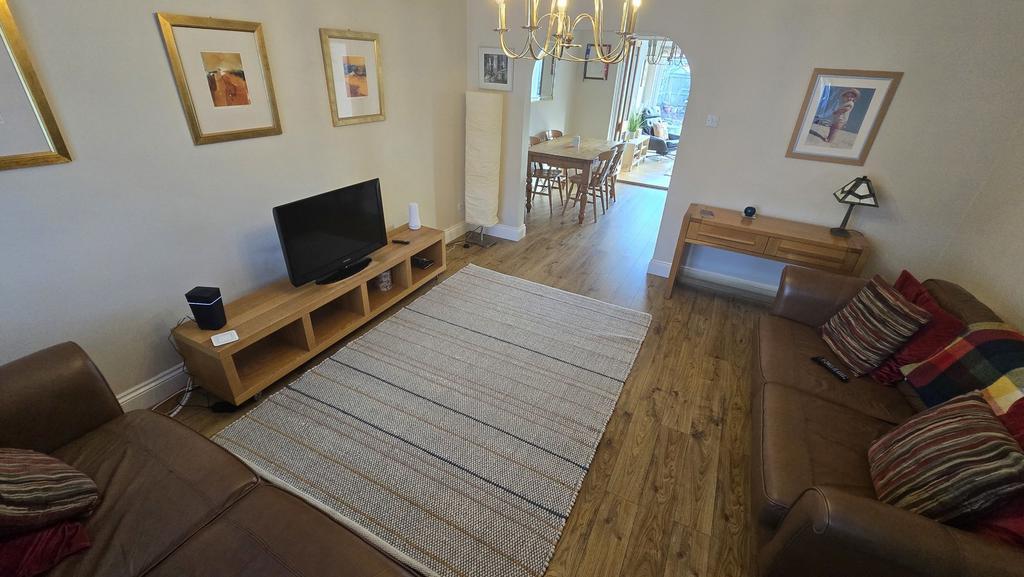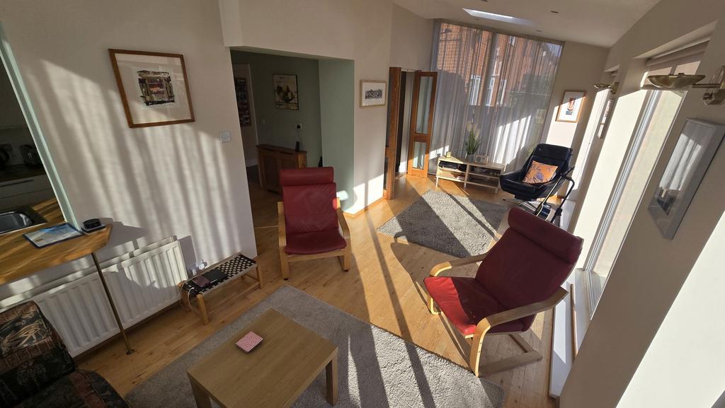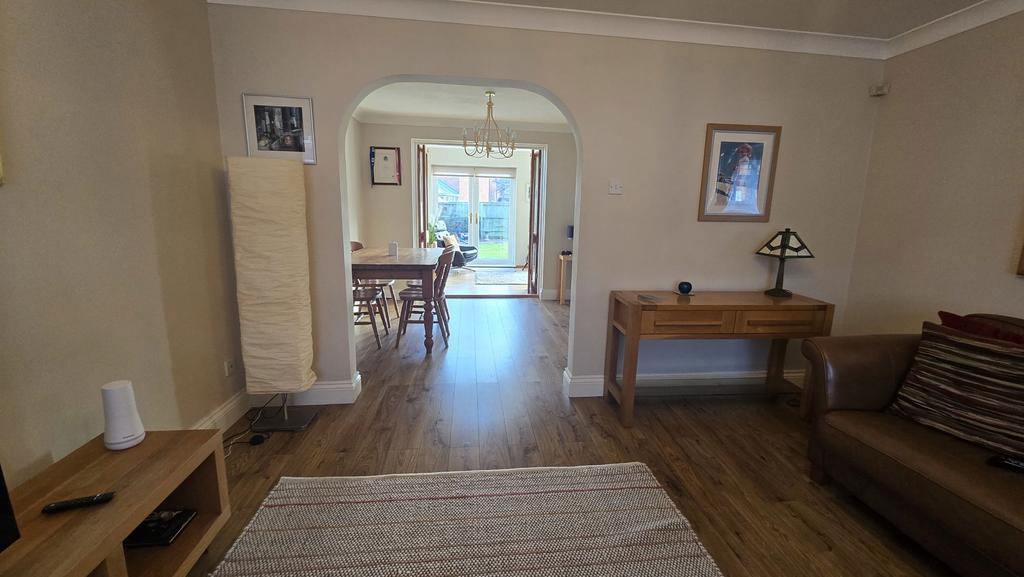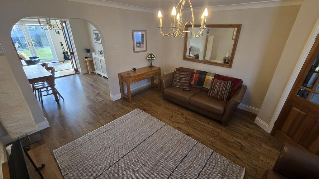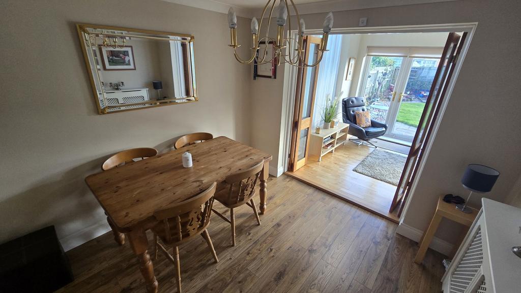 Rear aspect UPVC double glazed windows and French door. Engineered wood flooring