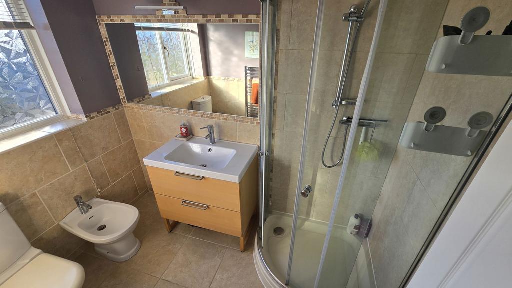 Front aspect UPVC double glazed window. 4 piece bathroom suite, including walk in shower cubicle, vanity basin, bidet, and low level W/C