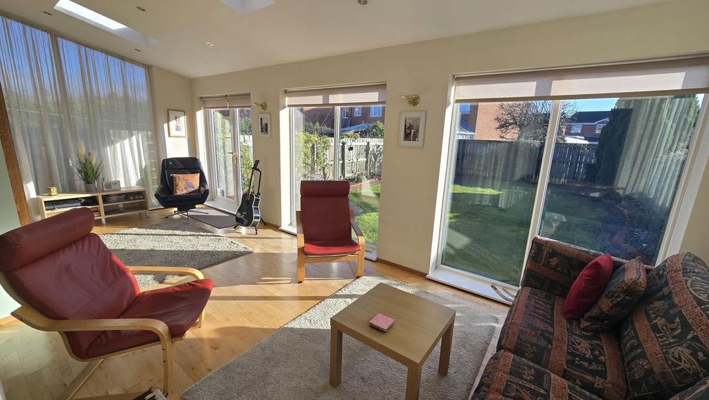 Situated in a prime position on this sought-after estate, the property is immaculately presented and ready for immediate occupancy. Upon entering, you are greeted by a welcoming entrance hall that leads to a spacious living room, a second reception room, and a modern kitchen with an adjoining utility room. The extended sunroom spans the full width of the home, providing a bright and airy space for relaxation and entertainment. The ground floor also features internal access to an attached garage and a convenient W/C.