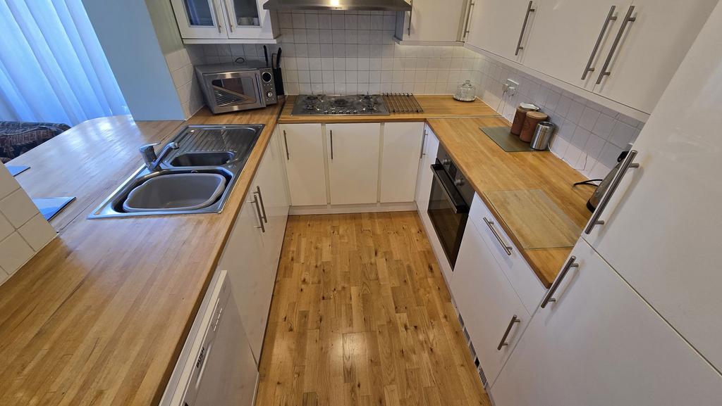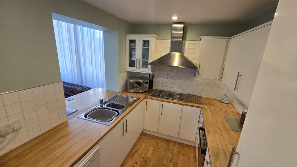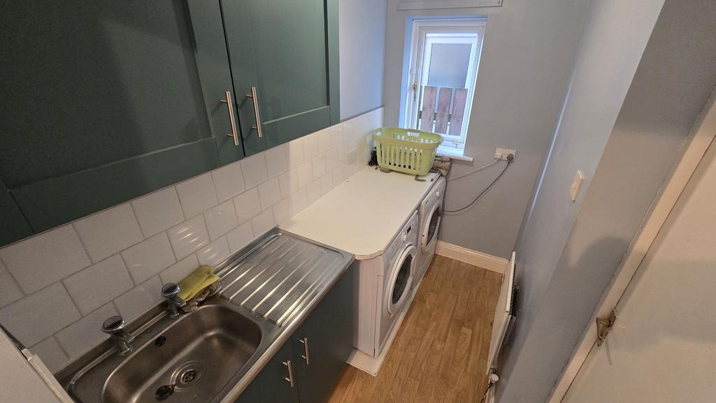 Side aspect UPVC double glazed window. GCH radiator. Wall and base cabinet. Stainless sink. Plumbing for washing machine