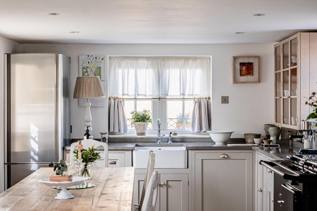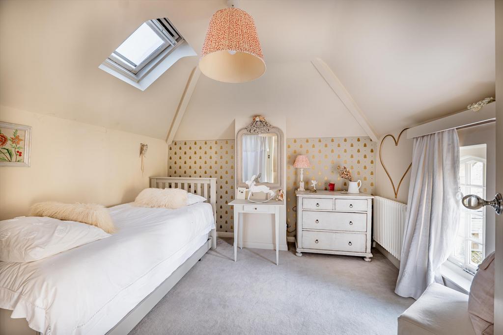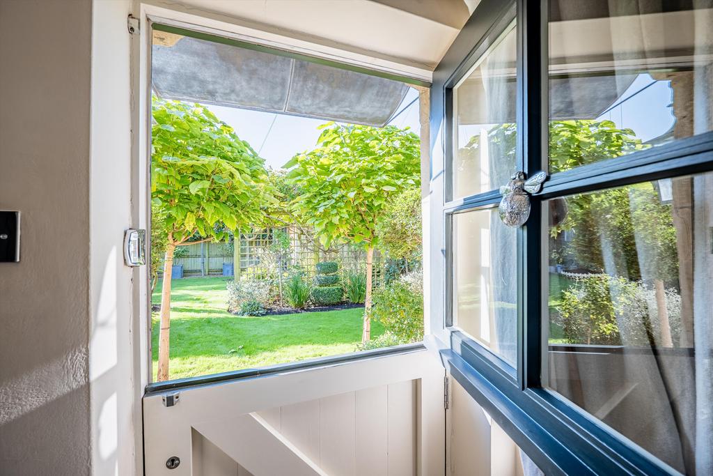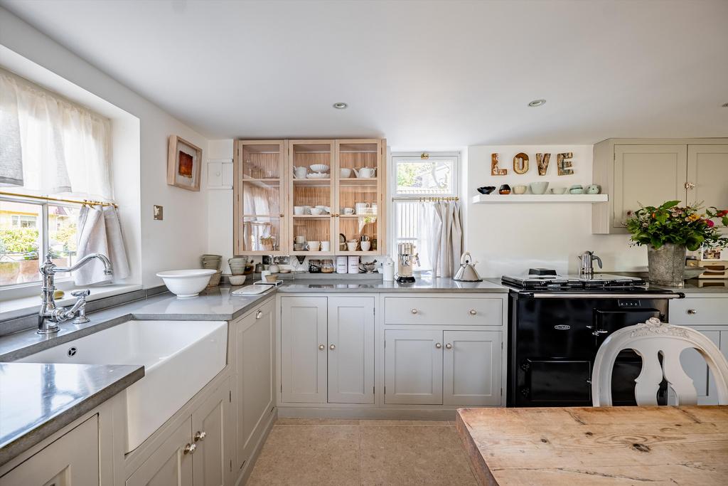 Situated on a corner plot, the house and garden are enclosed by walls on all sides, with the main entrance through a garden gate on one side, leading to the front door at the centre of the house. Inside, the immaculate interior is filled with light from its multiple-aspect windows, and is decorated throughout in soft hues of Fired Earth Travertina Crema paint. A spacious hallway has room for a desk/study area and storage, including a utility cupboard.