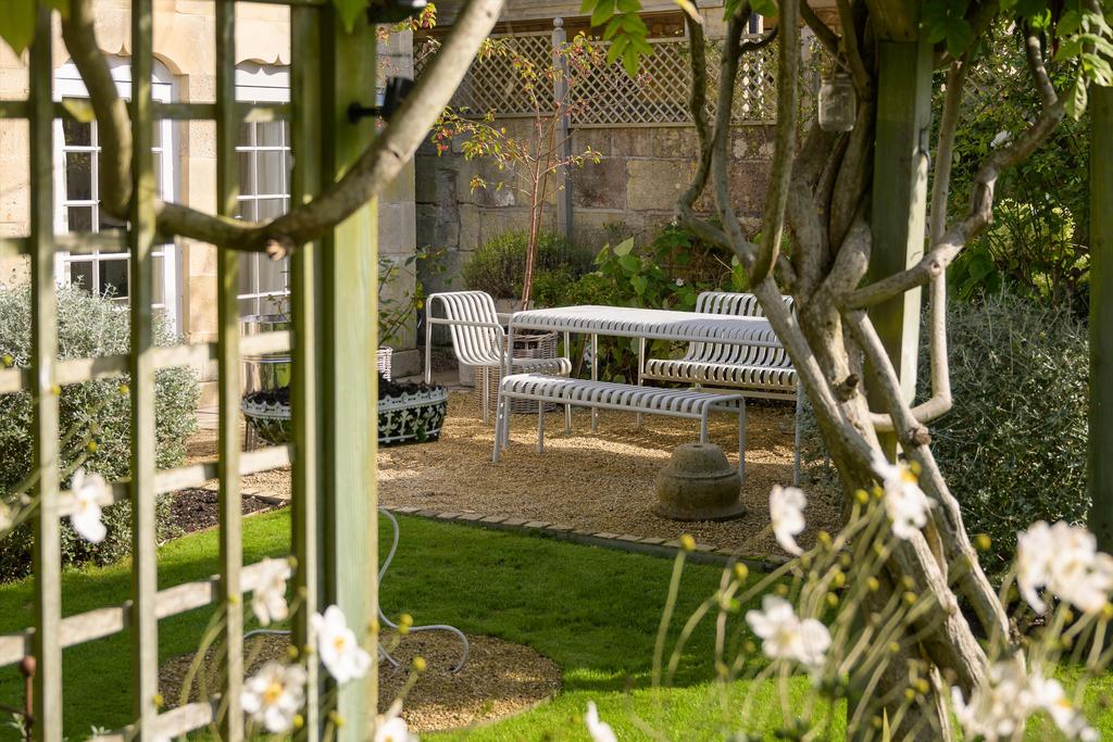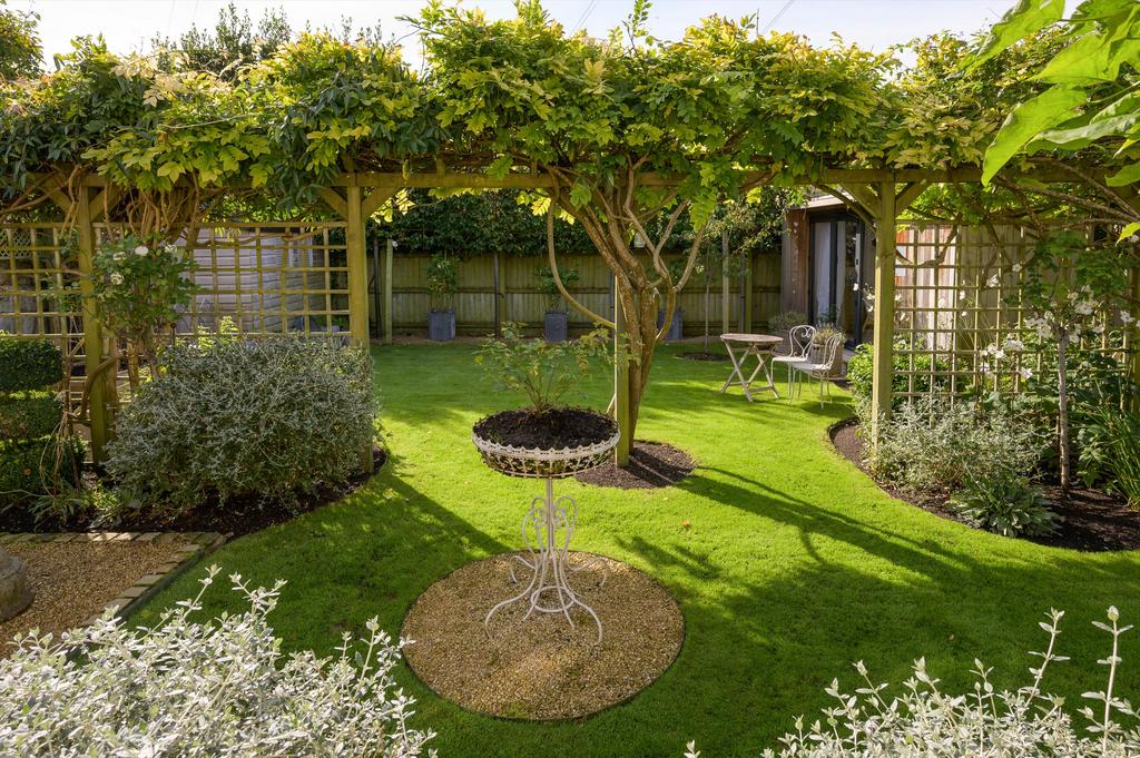 Enclosed by walls on all sides, this pretty and tranquil garden has been thoughtfully designed. Close to the house, paving runs from the entrance gate to the front door. From there, a gravelled terrace is a perfect spot for outside dining, and is accessed directly from the living room glazed doors. Two lime trees frame the front door, and also provide 'entrance' onto the lawn, through a wooden trellis at the centre of which a vine grows, covering the top of the trellises either side. There's a second gravelled area with raised vegetable beds and a wooden shed.