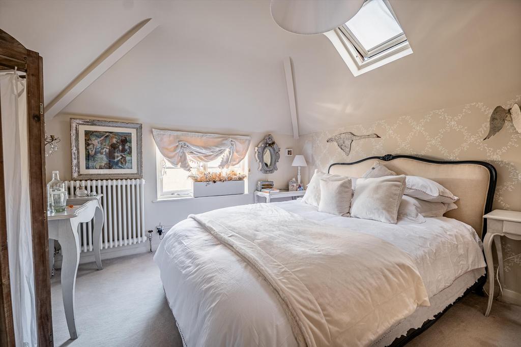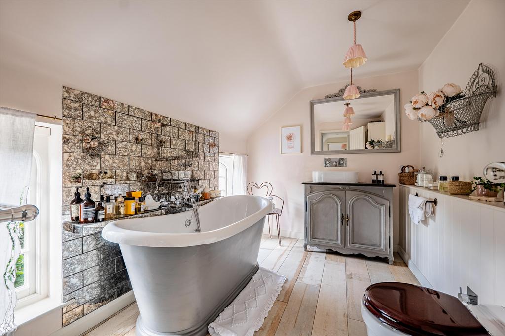 Upstairs is carpeted throughout (excluding bathroom), the landing/hall offering useful storage. Each of the rooms on this floor have ceiling shapes defined by the roofline; the hallway and bedrooms all featuring Velux windows. The bathroom's focal point is a deep, rolltop bath, flanked either side by windows.