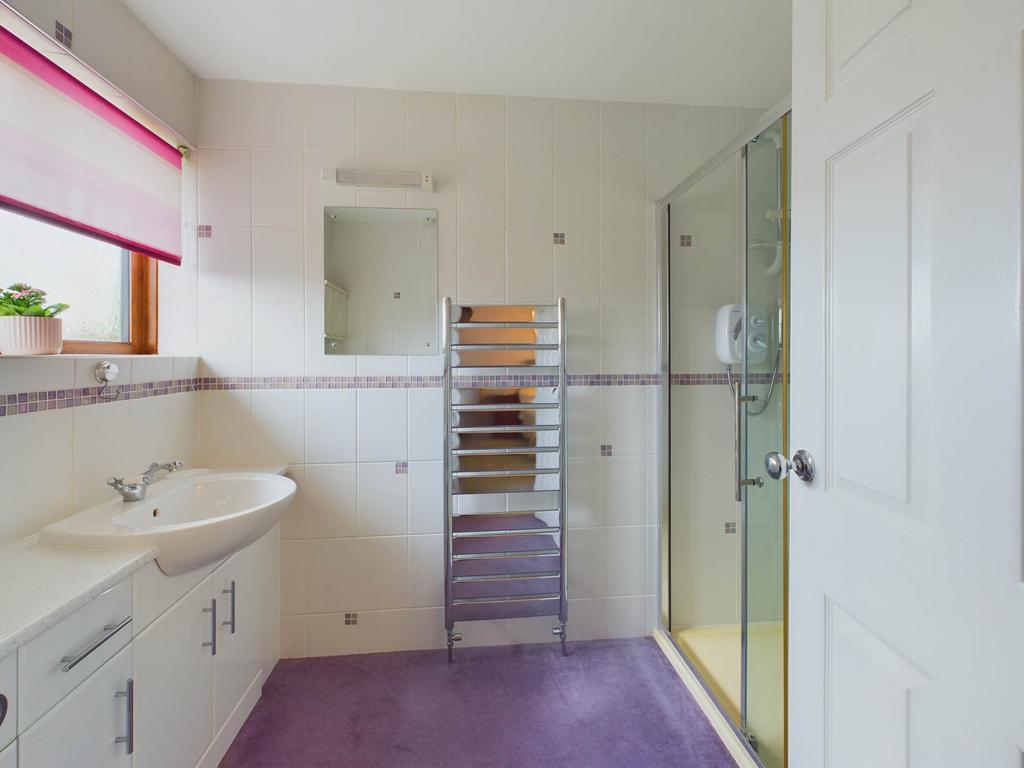 Comprising of encased cistern low level WC, vanity unit incorporating shaped wash hand basin with taps over and cabinets below. Double size shower cubicle housing the electric shower; with tray, sliding door and glass panel. Tiling to the walls, shaver point and heated towel rail. With uPVC double glazed frosted window to the rear elevation.
