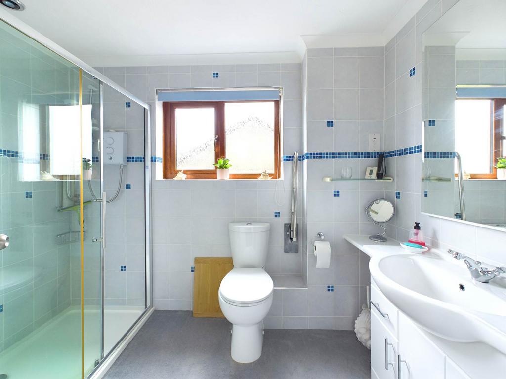 Comprising of low level WC, vanity unit with inset shaped wash hand basin and taps over, cabinet and drawer space below. A double size shower cubicle housing the electric shower with sliding door and shower screen . Useful toiletry cupboards, tiling to the walls, shaver point and uPVC frosted double glazed window to the side elevation.