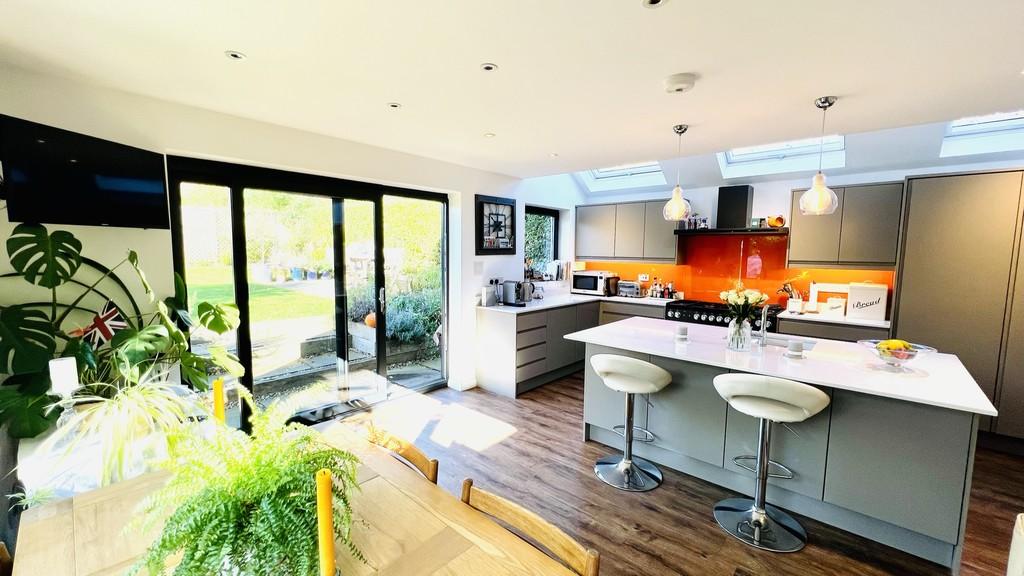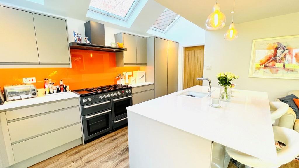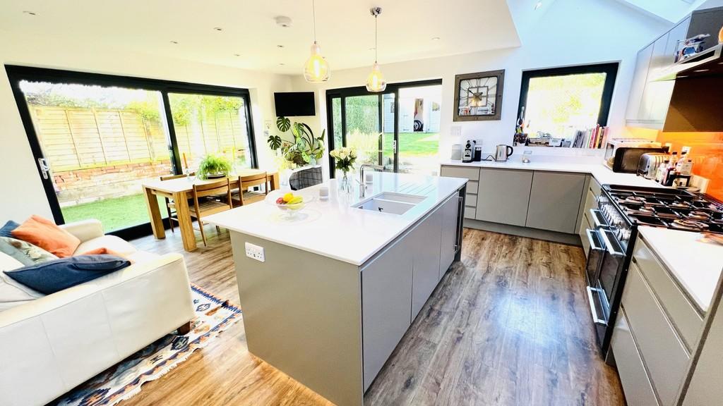 The kitchen/dining room is a real feature of the house with vaulted ceiling and skylights, beautiful fitted kitchen with integrated dish washer, wine cooler, large fridge with cold box and separate integrated undercounter freezer. Large island unit which doubles as a breakfast bar, gas range cooker with extractor hood. Patio doors leading to the rear garden and patio doors leading to the courtyard. Ample space for table and chairs and further casual seating. TV point.