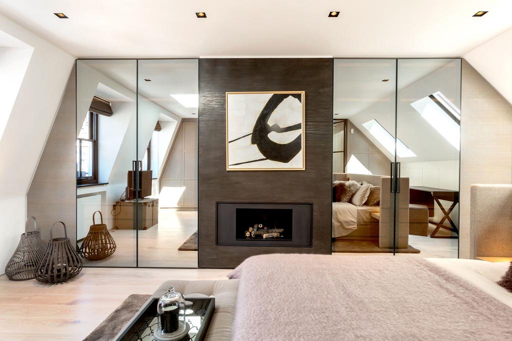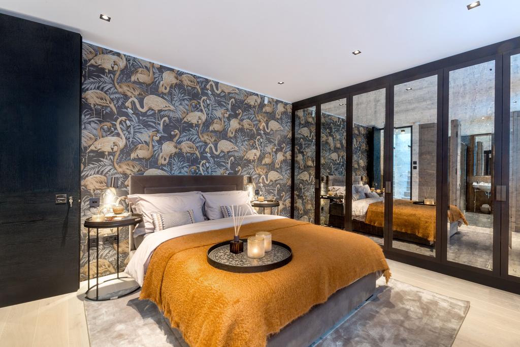 The second-floor master suite serves as an elegant sanctuary, featuring tasteful wallpaper, ceiling-height built-in wardrobes, a private dressing room and a charming fireplace. The beautifully designed en-suite bathroom includes both a bathtub and a separate shower, creating a spa-like atmosphere within the home.