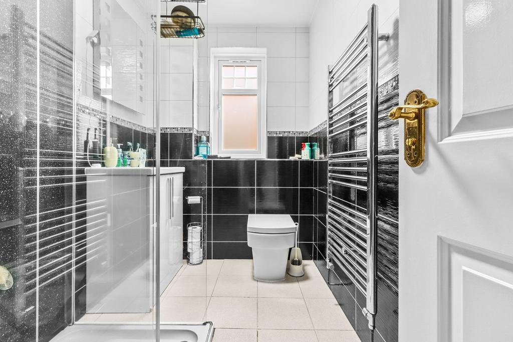 Obscure double glazed window to side, white suite comprising low level w.c, vanity wash basin with mixer tap, shower cubicle, tiled walls, tiled floor, heated towel rail.