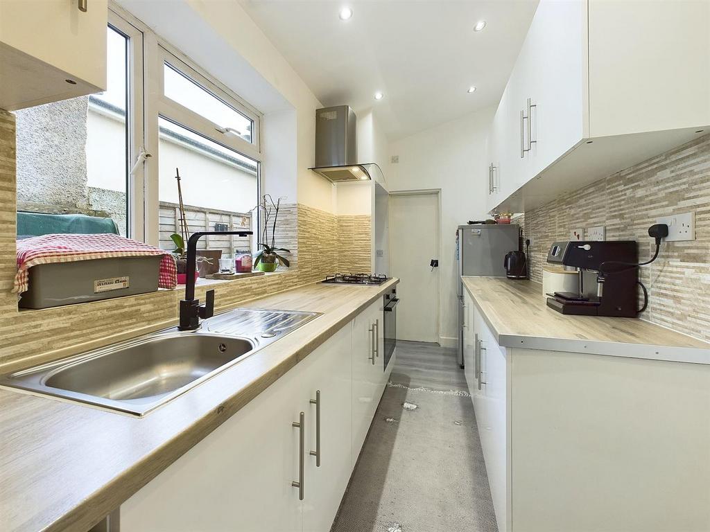 Kitchen - Range of base, wall and drawer mounted units, roll top worksurfaces, sink unit with mixer tap over. Appliance points, power points, oven/ grill with four ring gas hob and extractor hood over. Space for tall fridge freezer and washing machine, wall mounted radiator, side aspect upvc double glazed window, rear aspect upvc double glazed door opening out to the garden. Door leads off: