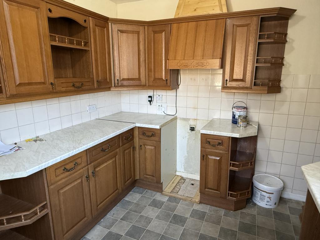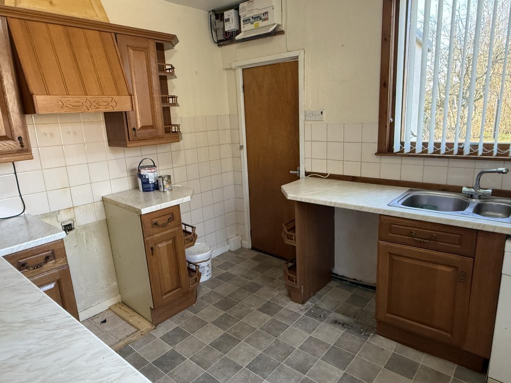 Fitted wall and base units. Double drain sink unit with mixer tap. Radiator. Double aspect windows. Extractor hood above space for the cooker. Tiled above the work tops. Electric meter and fuse box. Vinyl floor covering. Door to:
