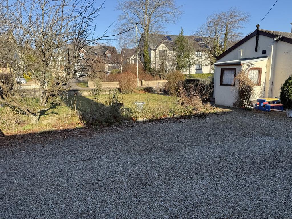 Graveled driveway to both sides of the property with parking to the rear. Sheltered patio area. Detached concrete store. To the front there are mature shrubs and borders enclosed by a low wall.