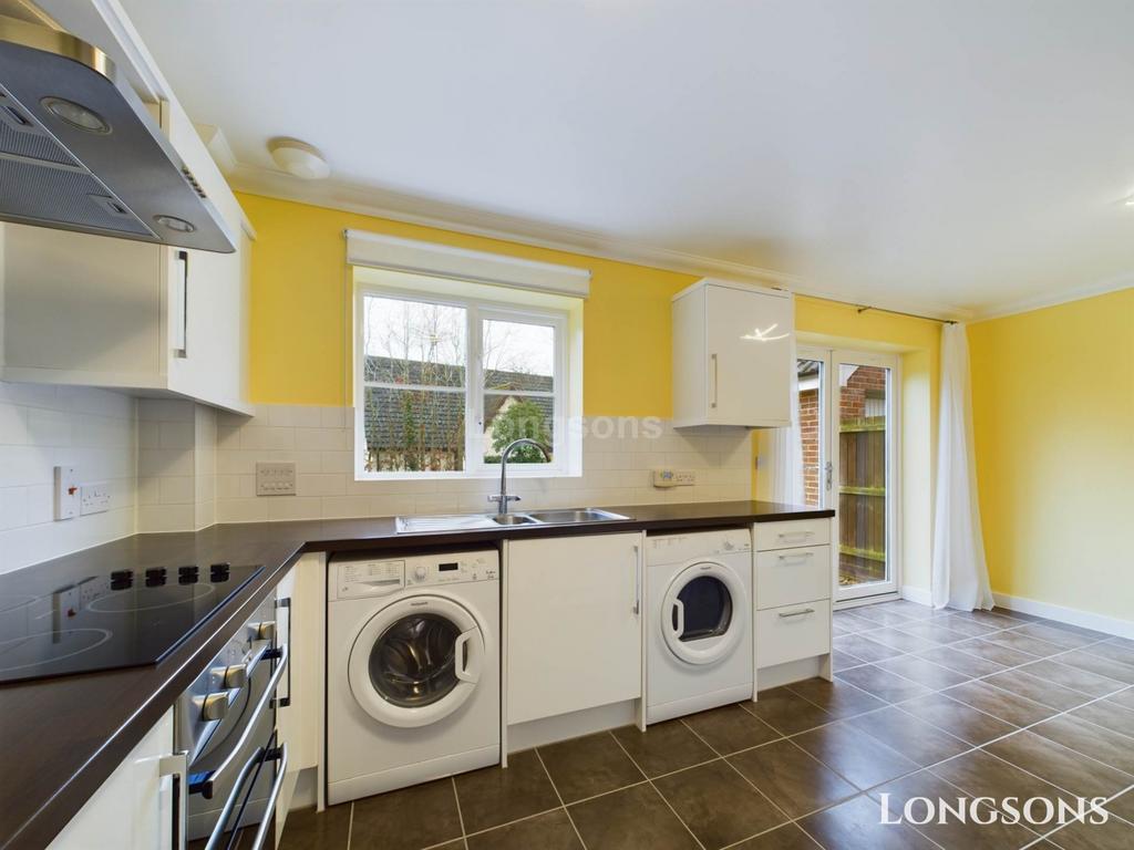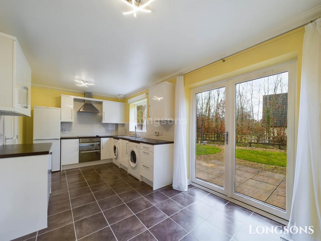 Range of units to walls and floor, work surfaces over, inset stainless steel sink unit with mixer tap and drainer, tiled splashback, integrated electric oven with ceramic hob and extractor hood over, space and plumbing for washing machine and dishwasher, space tall fridge/freezer, tiles to floor, UPVC double glazed window to rear, radiator, double glazed French doors opening to rear garden.
