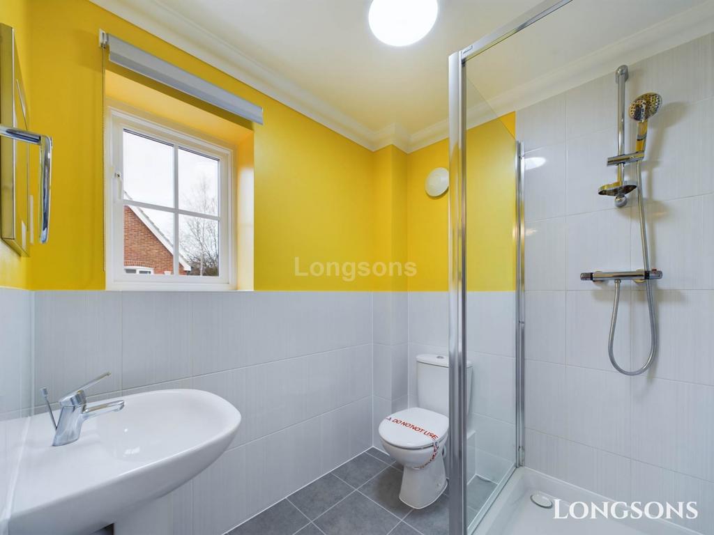 Shower cubicle, tiles to walls and floor, obscure glass double glazed window to front, WC, wash basin.