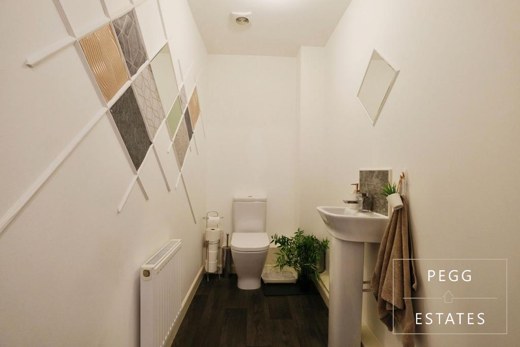 Laminate flooring, partly tiled, radiator to side, pedestal sink, extractor.